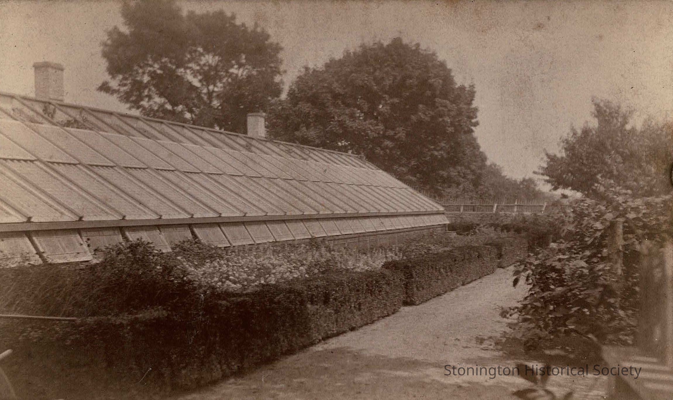 An exterior view of another greenhouse at Stone Acres Farm. The date written on the back of the photograph is 1905. This shows not just the greenhouse, but the surrounding gardens and pathway.Collection