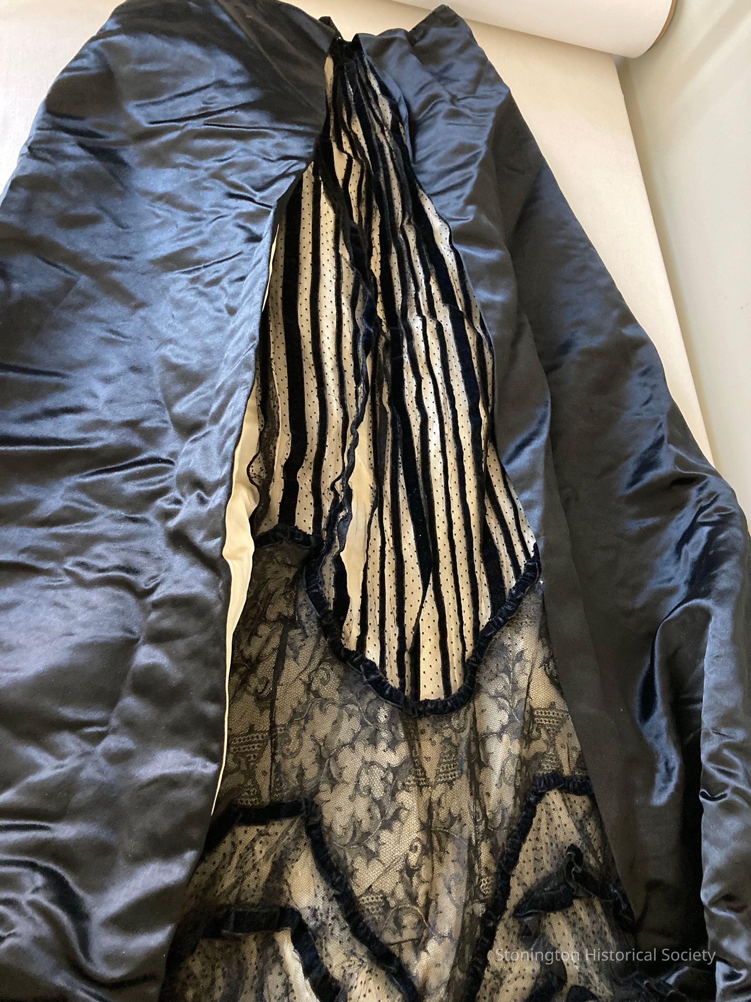 Black satin with central panel of crean satin, silk and black netting with narrow strips of