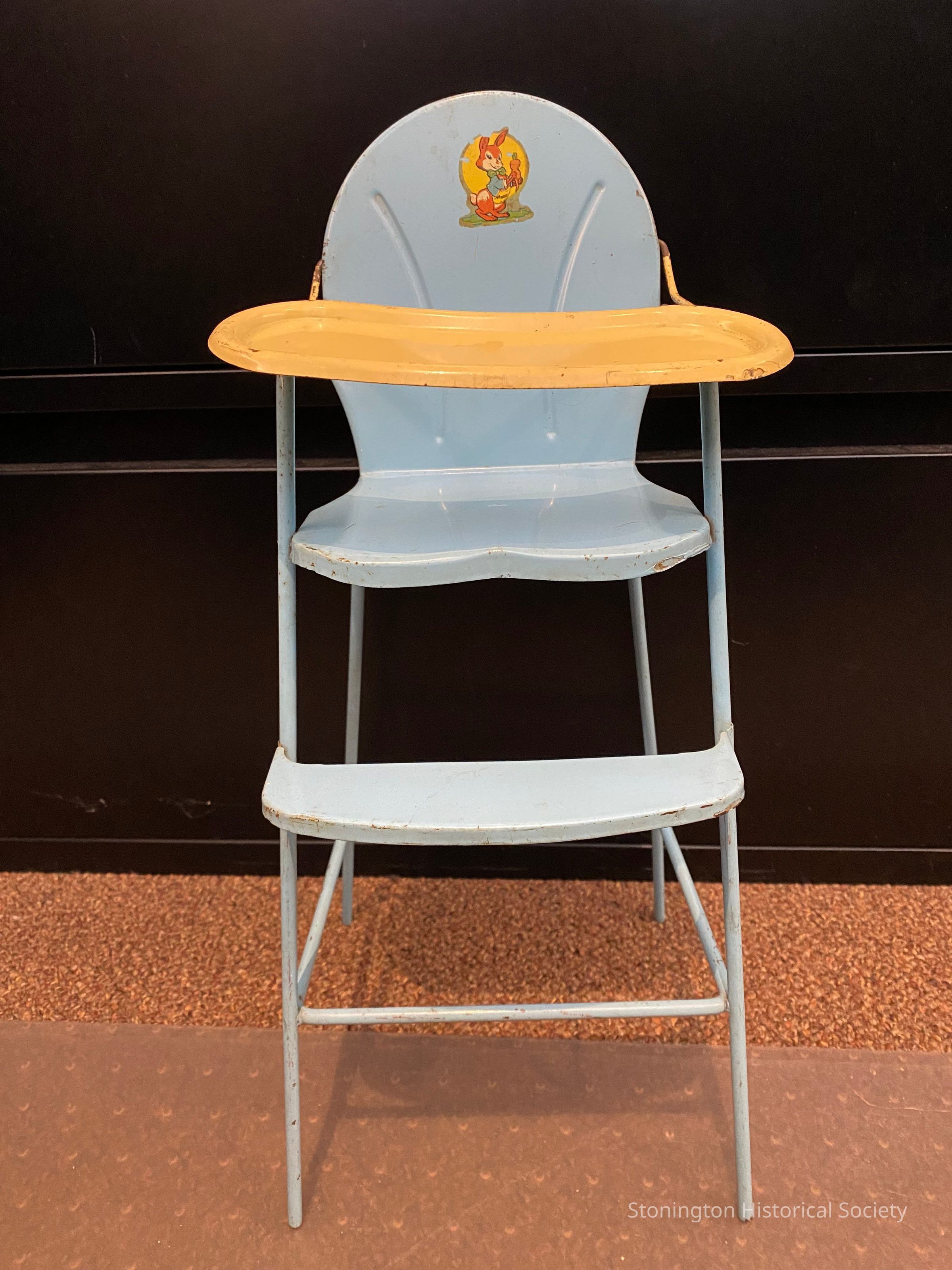 Blue metal doll's high chair made by Amsco from the 1950s. Measures 17.5 inches tall and about 6.5 inches wide. Chair is baby blue metal with a small foot rest and a yellow lever action tray. On the back center of the seat is a sticker of a rabbit in a green bow tie with an Amsco apron on. Slight wear on covers from use.Collection