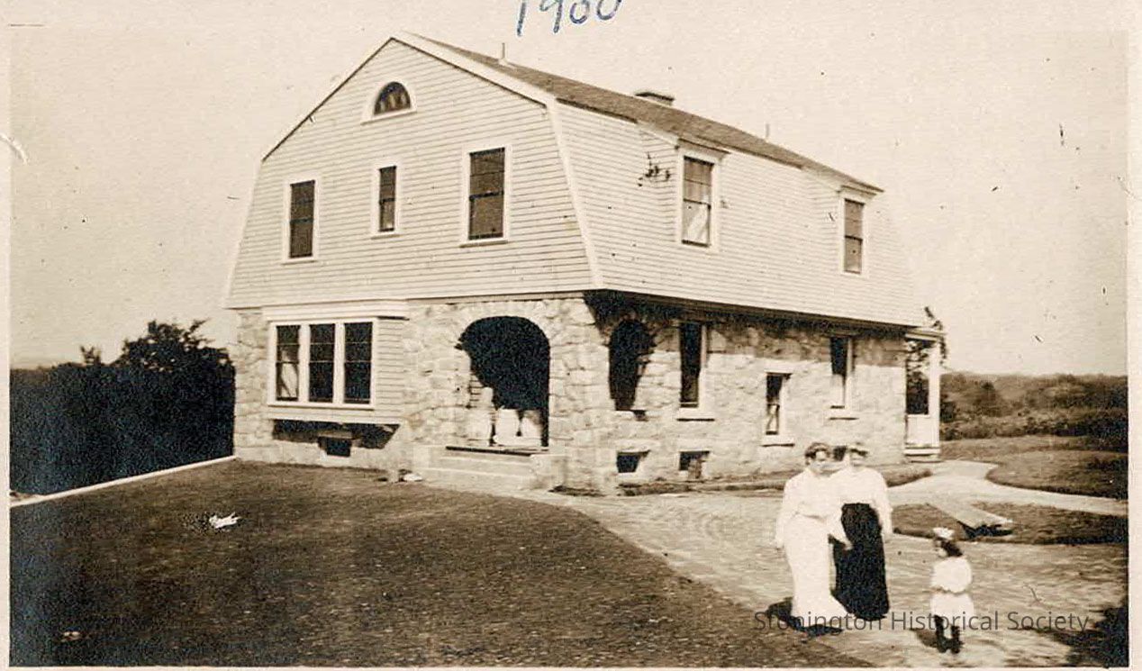 An exterior view of the stone cottage, across North Main Street from the main house at Stone Acres. Two women and a little girl are walking in front of the house, which appears to be newly built.Collection