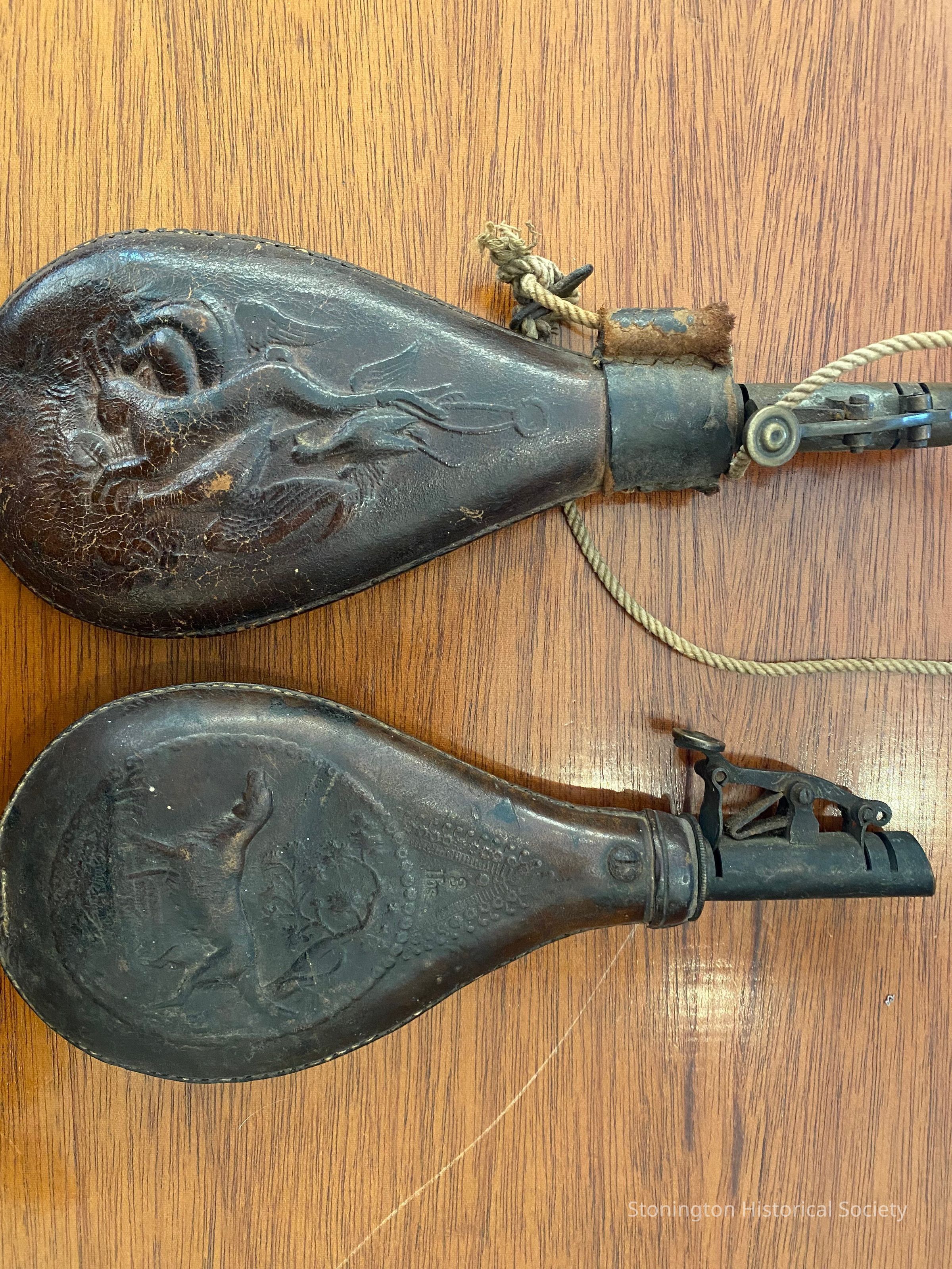 A pair of black powder flasks manufactured by the American Flask and Cap Company in New York City. Each of the flasks holds 3 lbs of black powder pellets. One of them depicts a rabbit and three birds hung by their feet, as if they had been hunted. The other features a liekness of a hunting dog in front of some trees. Both are made of leather which is in pretty good condition considering their age. The lever action on both caps is still functional, and one still has the cordage attached. Made of dark brown leather.