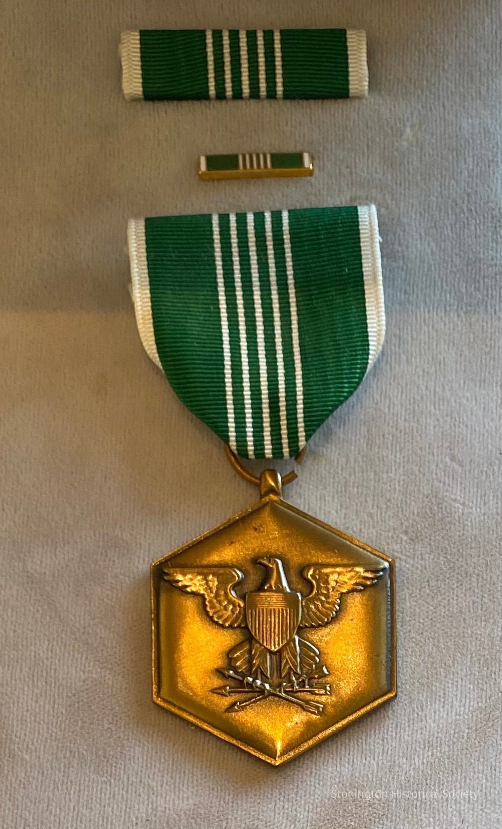 World War 2 "Military Merit" Medal and service ribbon in case, awarded to Staff Sergeant Maurice La Grua "For Military Merit," c. 1945. Eagle embossed medallion with a green and white ribbon.
