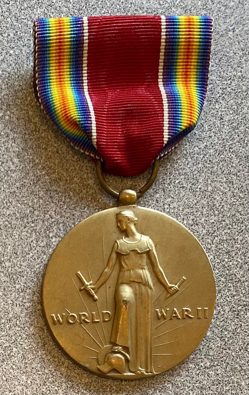 WWII Victory Medal and service ribbon, awarded to Staff Sergeant Maurice La Grua for service in the Army during WWII.