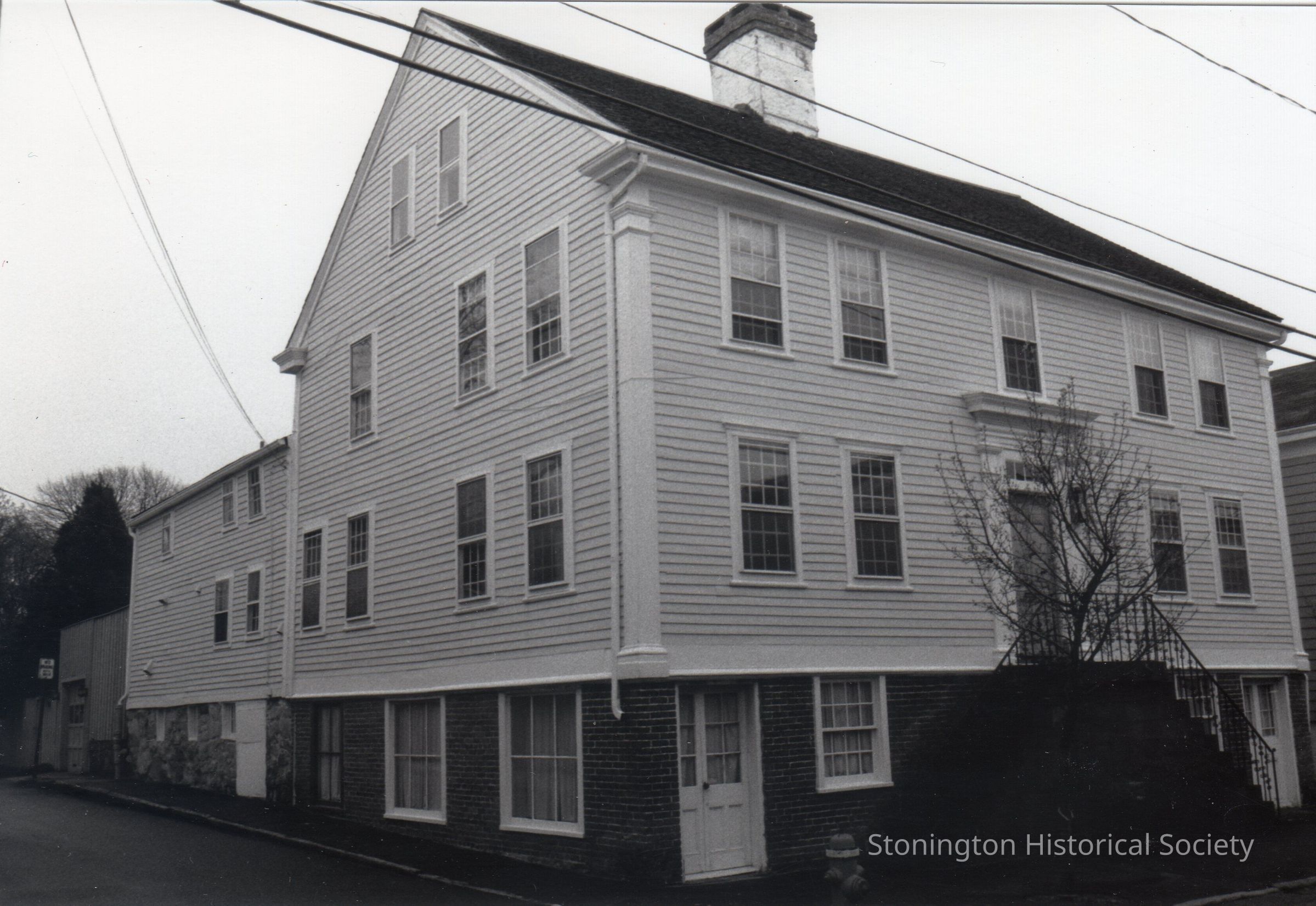 Black and white photograph of the Amos Sheffield House, built 1765, Water Street, Stonington.