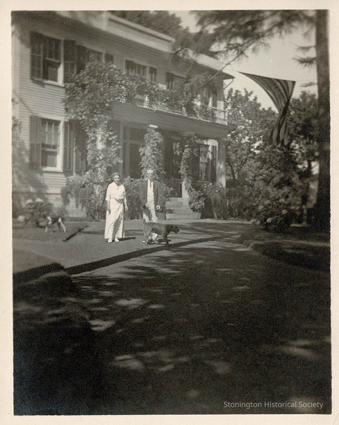 Photograph of Eugene and Lila Edwards standing outside of Stone Acres with their two dogs. Note all the growth on the front porch and the american flag hanging from the tree on the right. Back of the photograph reads "1914."Collection