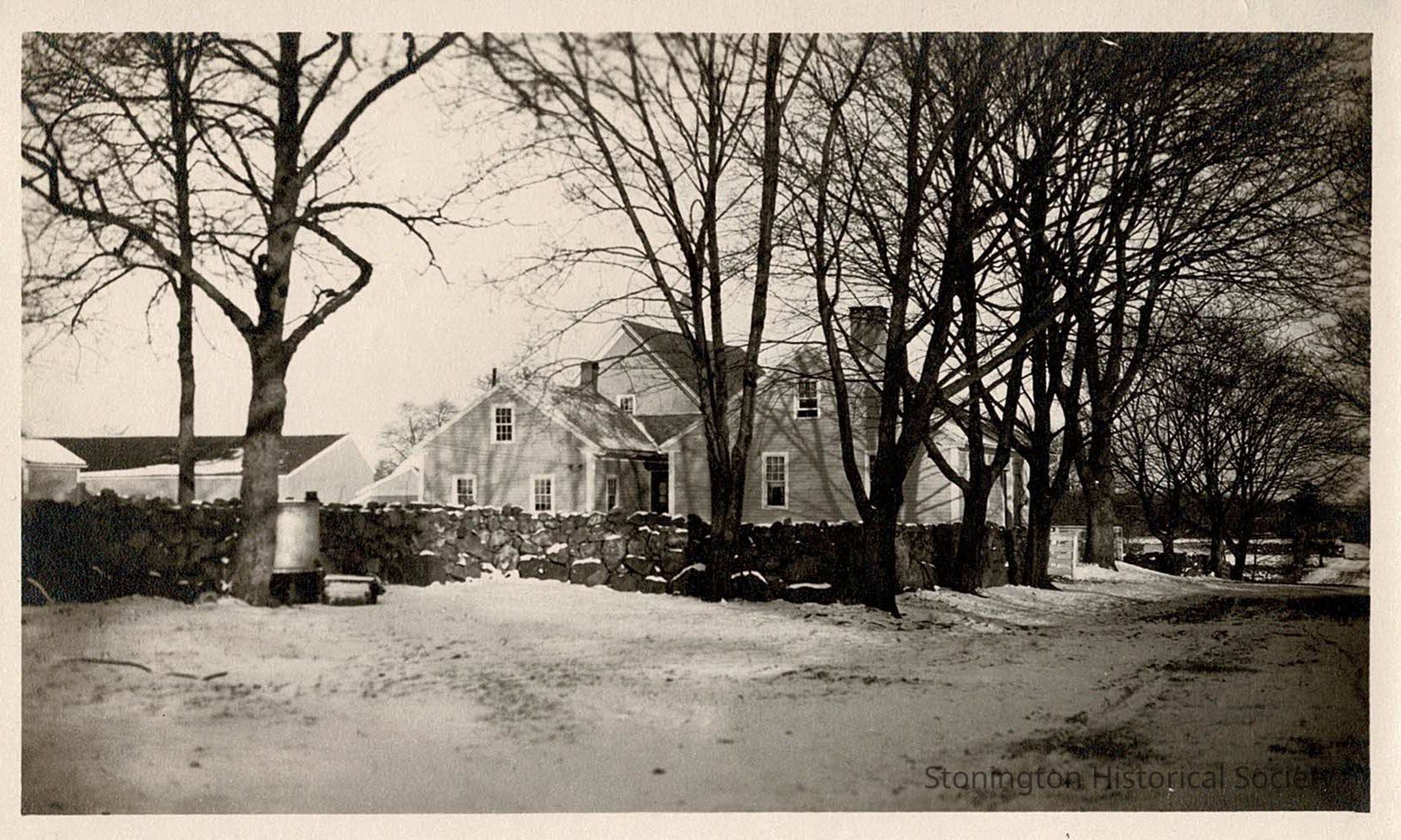 A photograph taken in December 1915 of the small cottage on the Stone Acres property, covered in snow. On the right a road is visible leading to more stone columns and presumably, North Main Street.Collection