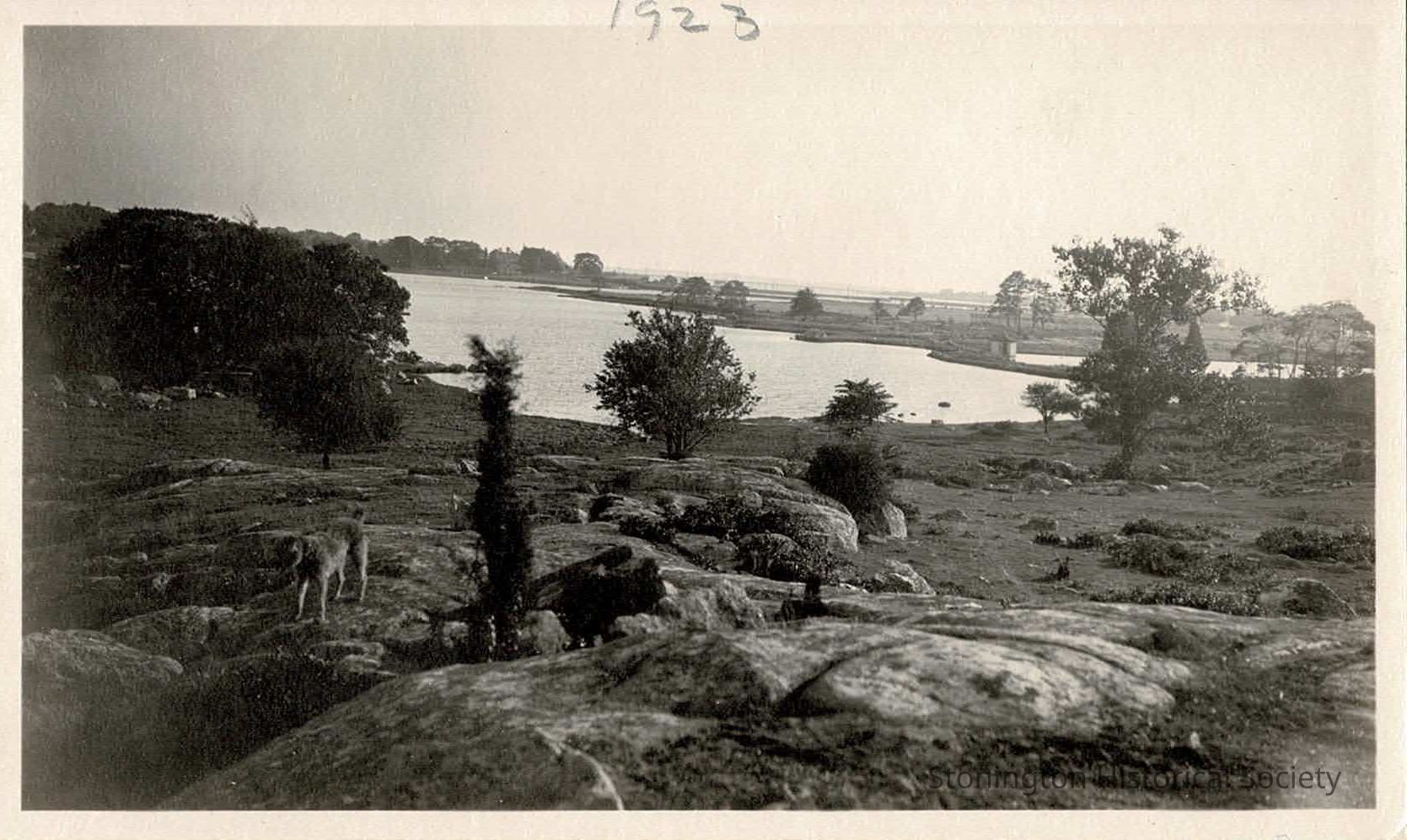 A landscape photograph taken of rocky terrain leading down to Quanaduck Cove, 1923. In the foreground on the left is a dog who was previously pictured with Eugene and Lila Edwards.Collection