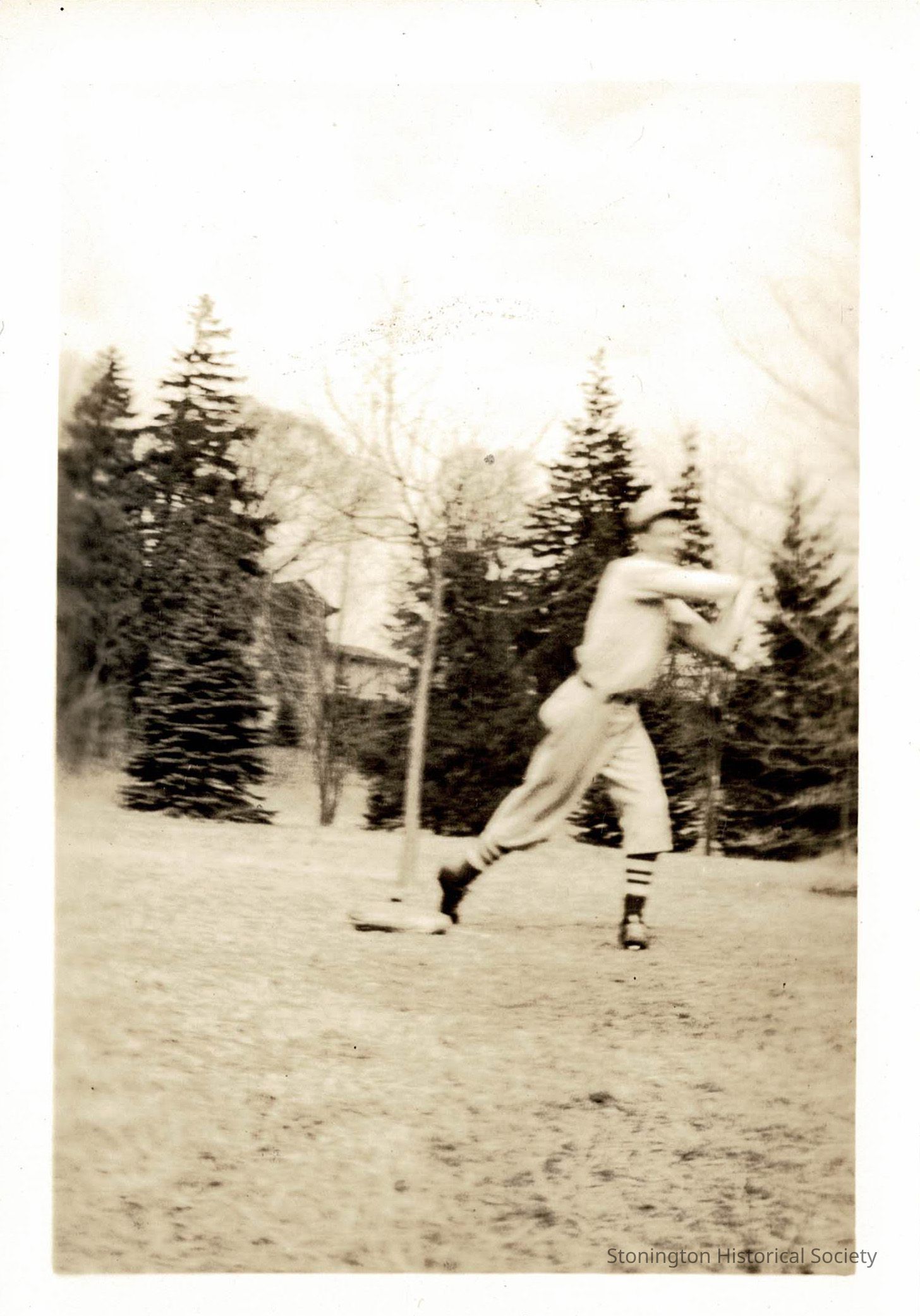 Photograph of a batter just after a hit on the baseball diamond in Owen's Field, undated. Elise Owen's home, Linden Hall, is visible through the trees at left center.Collection