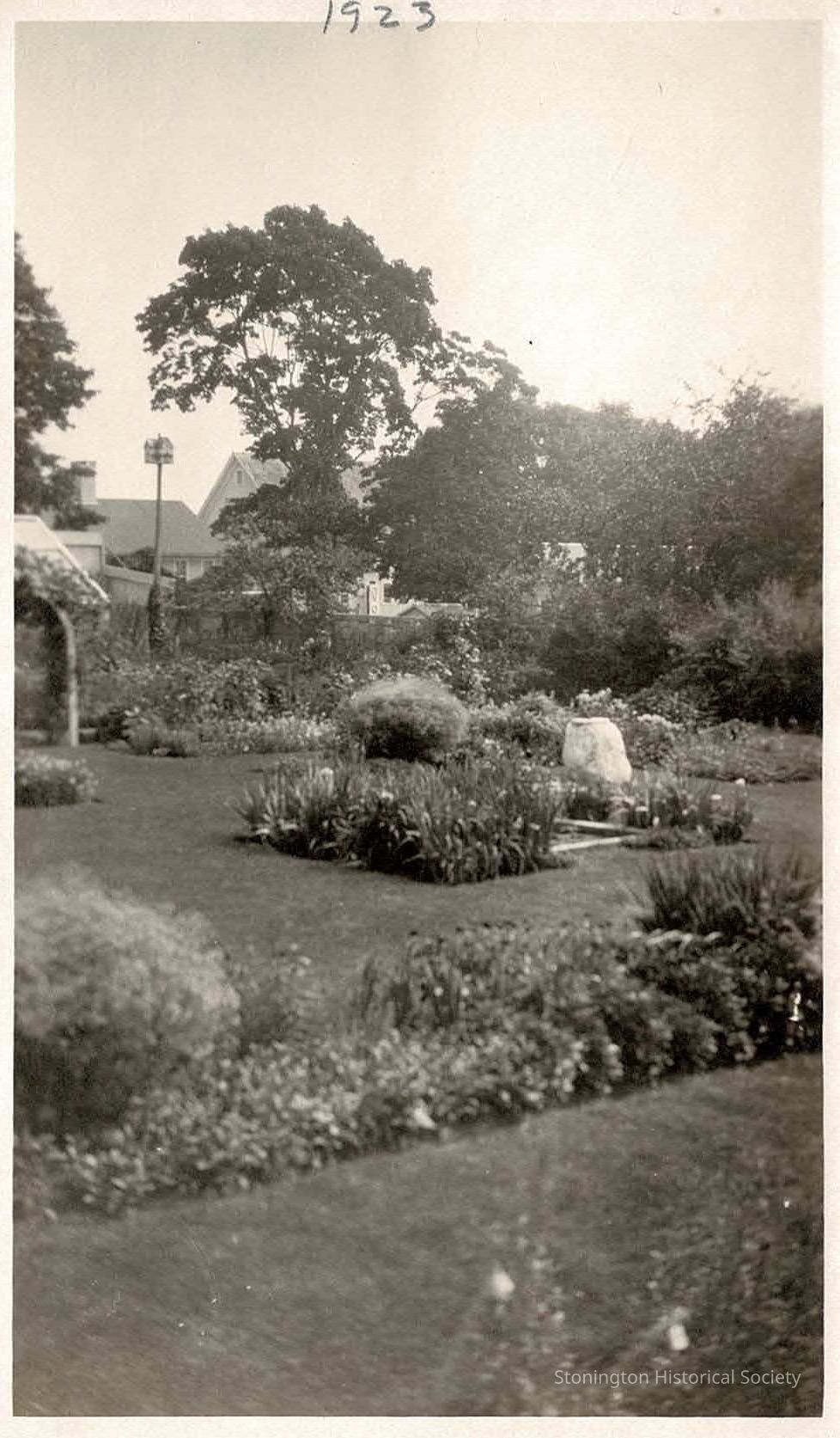 A photograph taken in the formal gardens of Stone Acres. The small pond and trellis are visible, so this was taken from the west side of the garden, closer to North Main Street. Some of the outbuildings are visible in the background.Collection