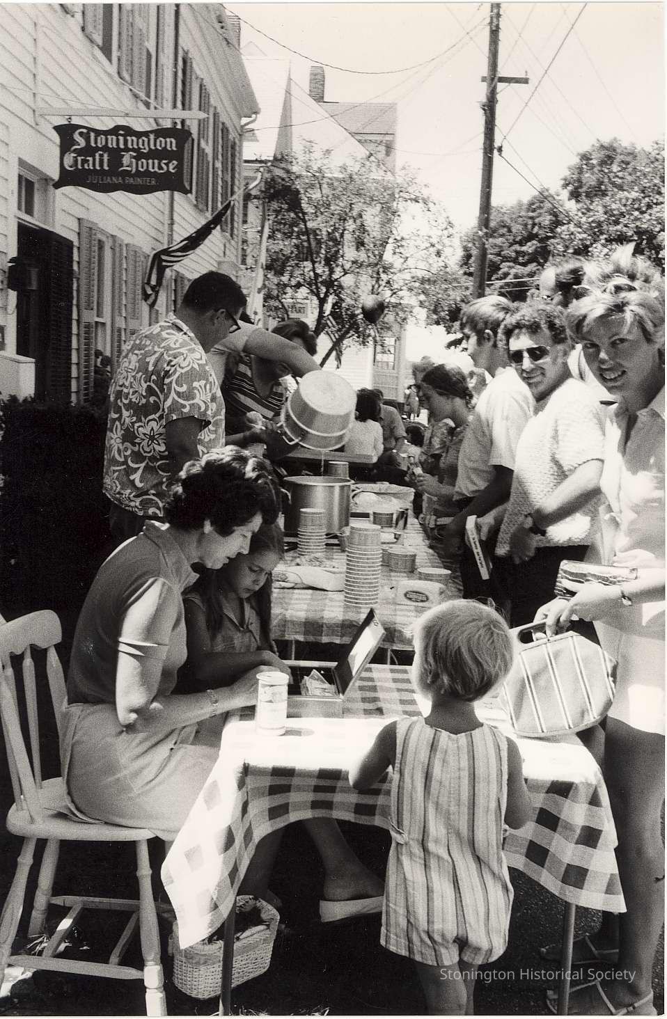 Village Fair - Soups at fair. Mrs. David (Kate) Johnstone and Richard (Wooly) Woolworth on left; Judith Dupont on right.Collection