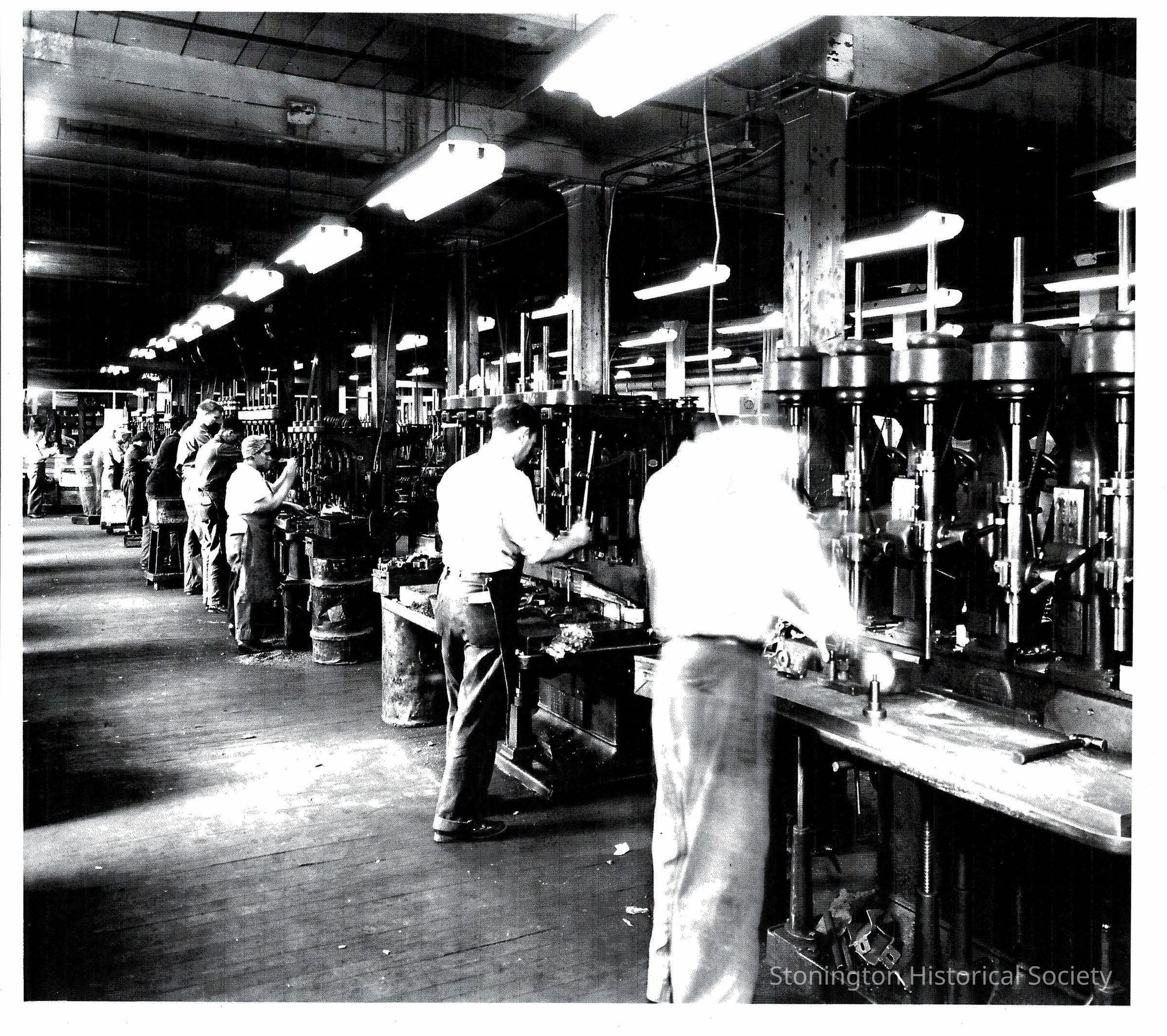 View of workers standing at their work benches in the Atwood Machine Company during the 1940s.Collection