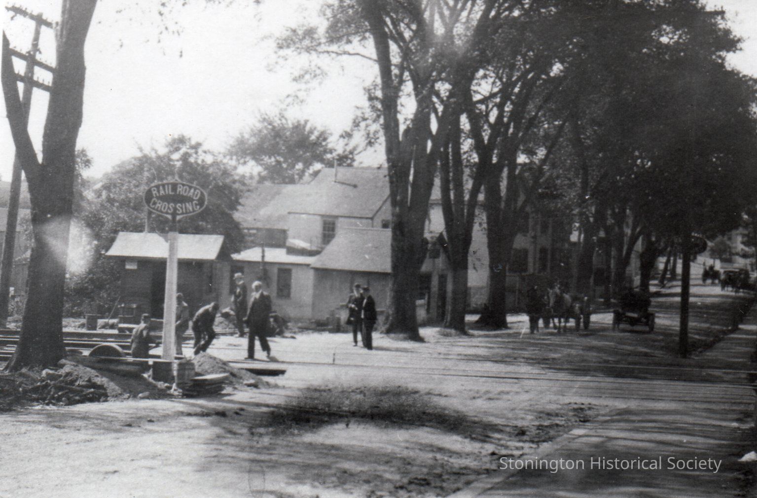 black and white photograph, 4x6, railroad crossing, Stonington Borough