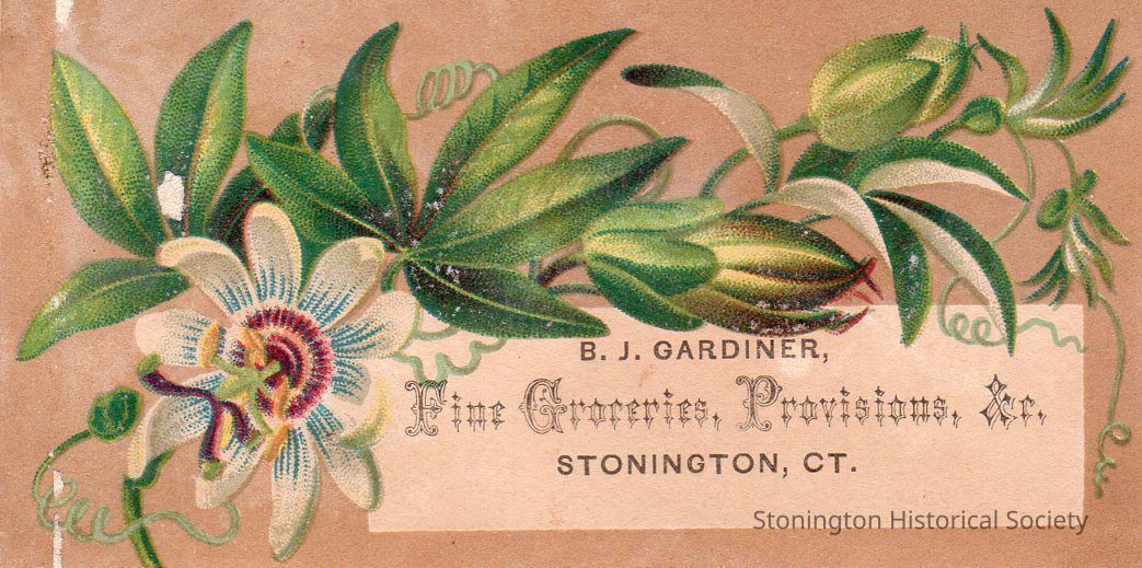 Trade Card, "B.J. Gardiner, Fine Groceries, Provision, &c., Stonington, CT." Byron J. Gardiner had a grocery store at 10 Elm Street in Stonington Borough.