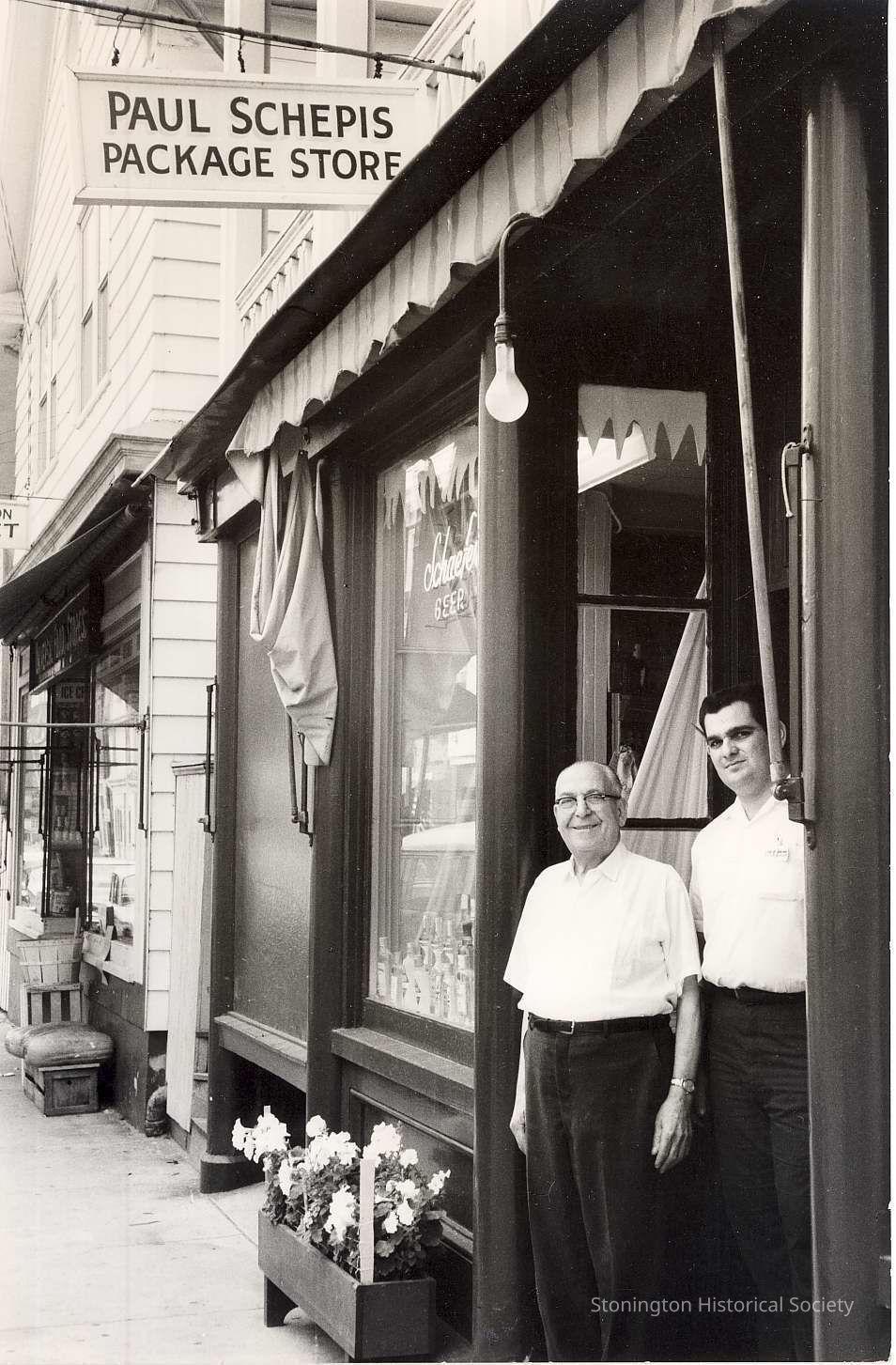 Paul Schepis and his grandson, Charlie Chiappone, in front of the package store with Stonington Market in background.