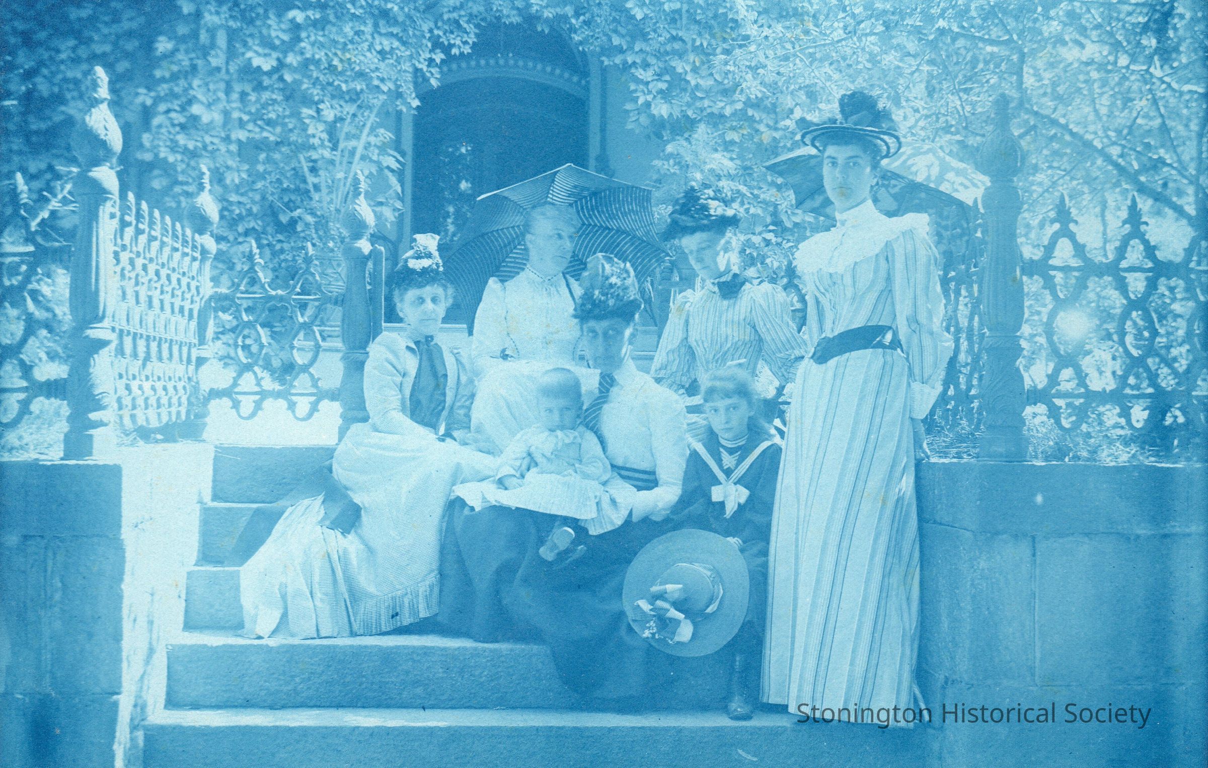 Cyanotype of women in the Trumbull family, c. 1890. Identified - Lizzie Trumbull, Nellie Trumbull, Jennie Trumbull and Minnie Trumbull at the Culbert Palmer house (originally the Horace Niles House) at 85 Main Street off Wadawanuck Square.