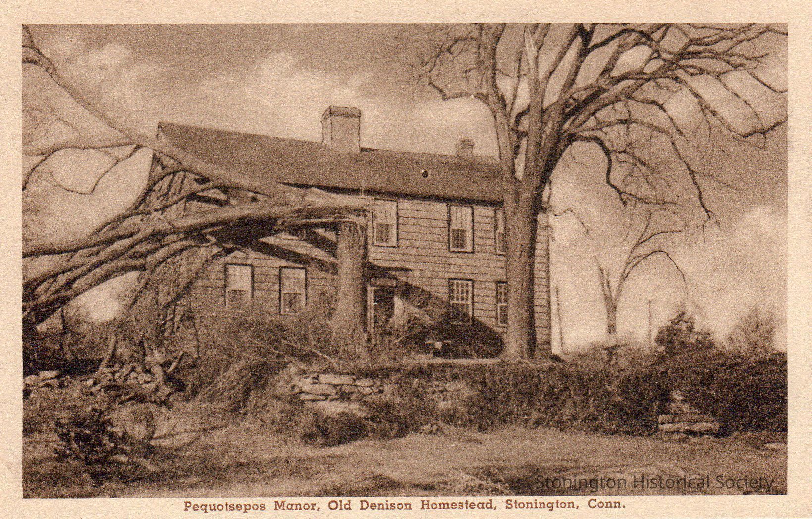 black and white postcard, "Pequotsepos Manor, Old Denison Homestead, Stonington, Conn." showing felled tree and hurricane damage the day after the 1938 Hurricane.Collection