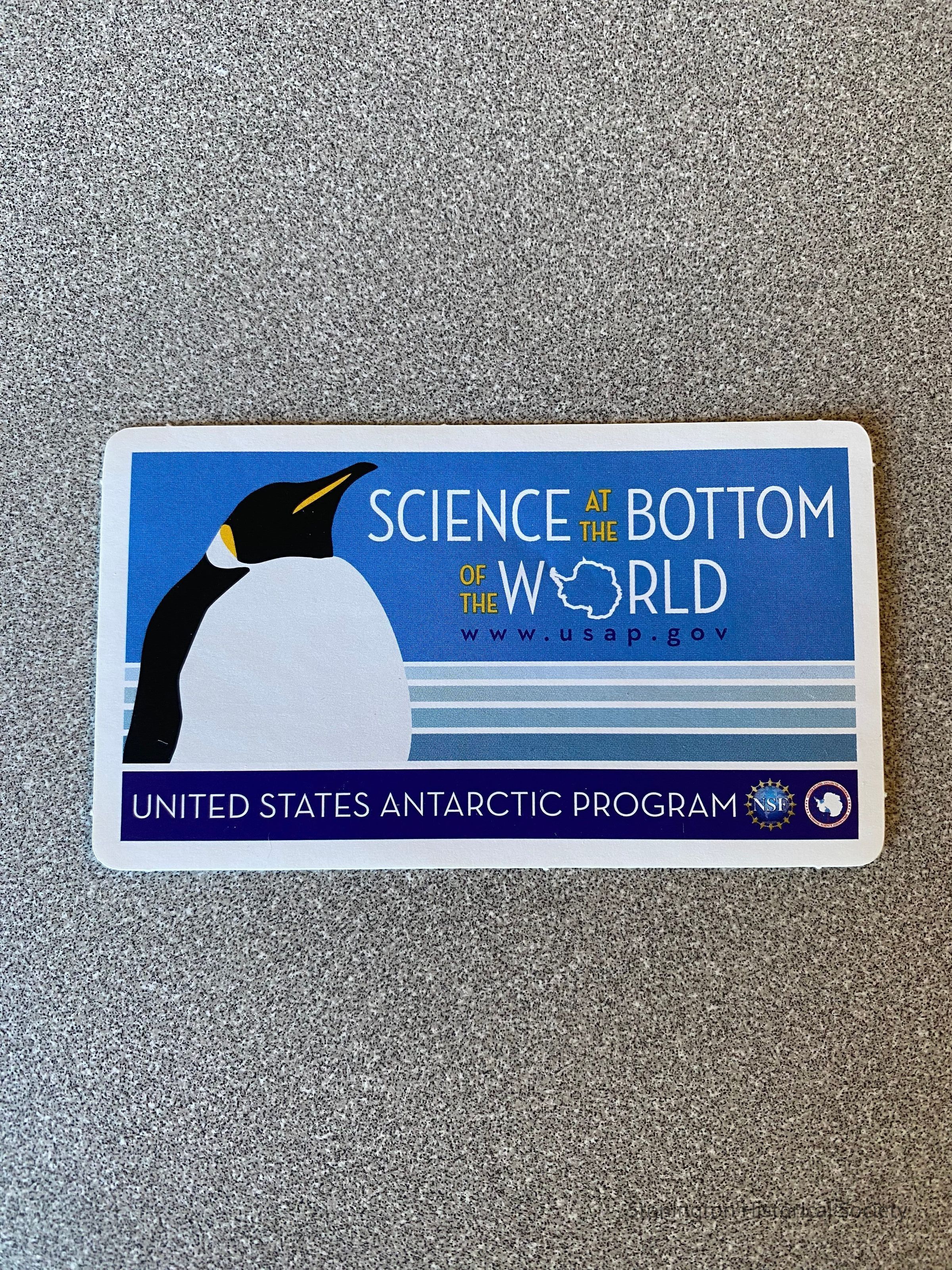 Small rectangular sticker that reads "Science at the Bottom of the World", United States Antarctic Program. Pictured on the sticker is an emperor penguin, one of seven species that can be found in Antarctica.