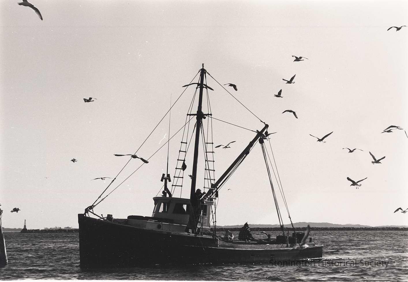 Fishing boat coming back in Stonington Harbor with breakwater in background. 2 copies.