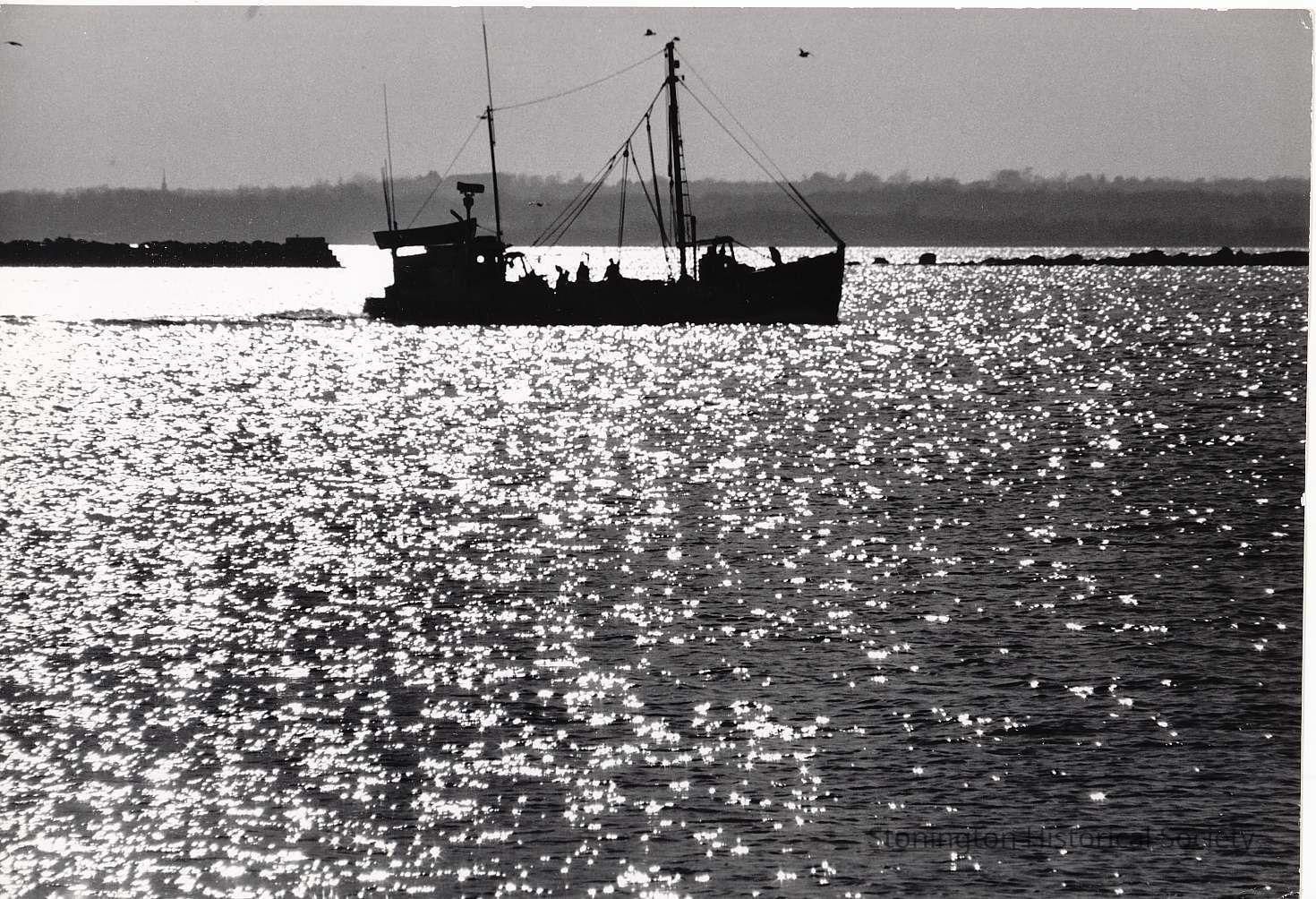 Fishing boat coming back in Stonington Harbor with breakwater in background.