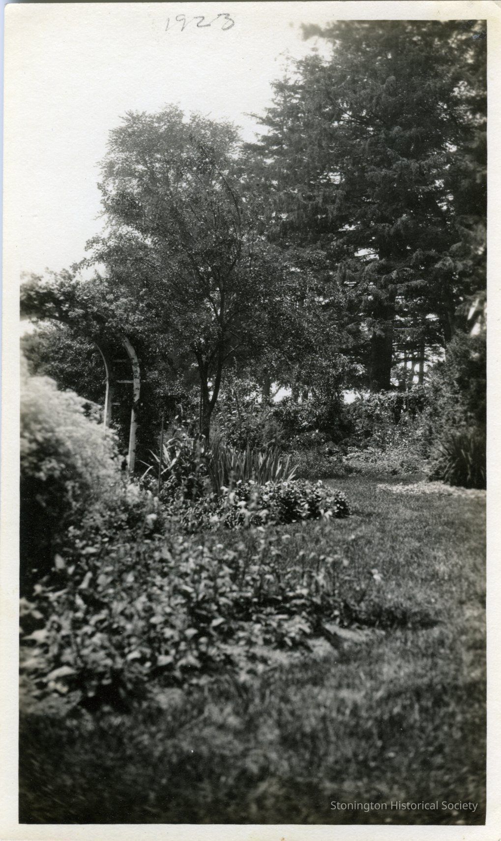 Photograph of the formal gardens at Stone Acres, looking north towards the greenhouse (out of view), c. 1923