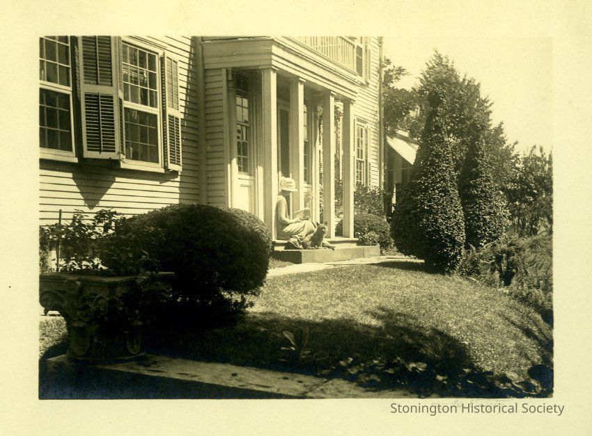 Garden doorway of "The Hill," residence at 35 Grand Street, with woman and dog on step: signed by George Tingley