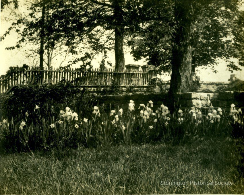 Bank of iris against a wall at "The Hill," residence at 35 Grand Street