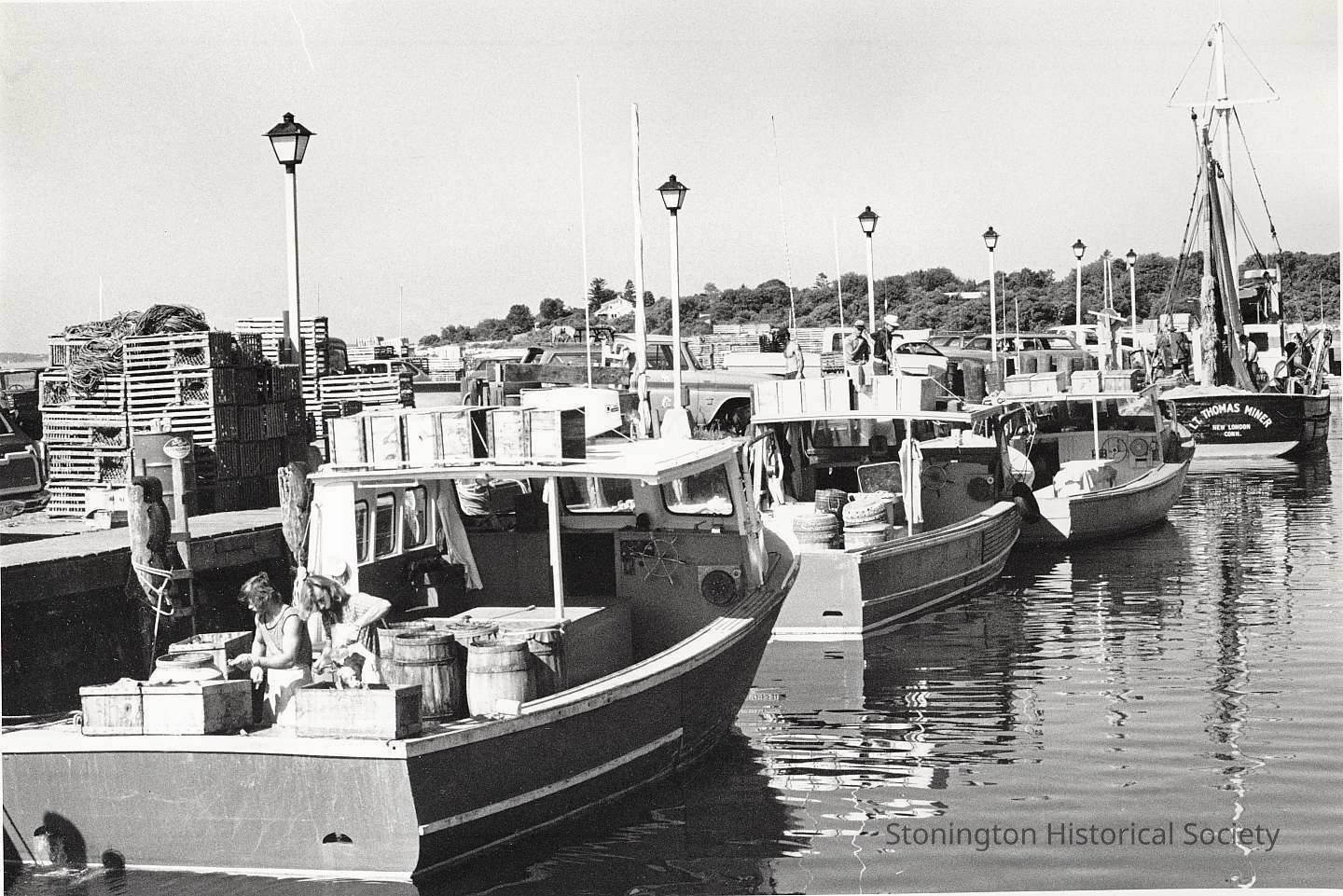 Various fishing boats tied up at dock including "Lt. Thomas Miner" of New London CT