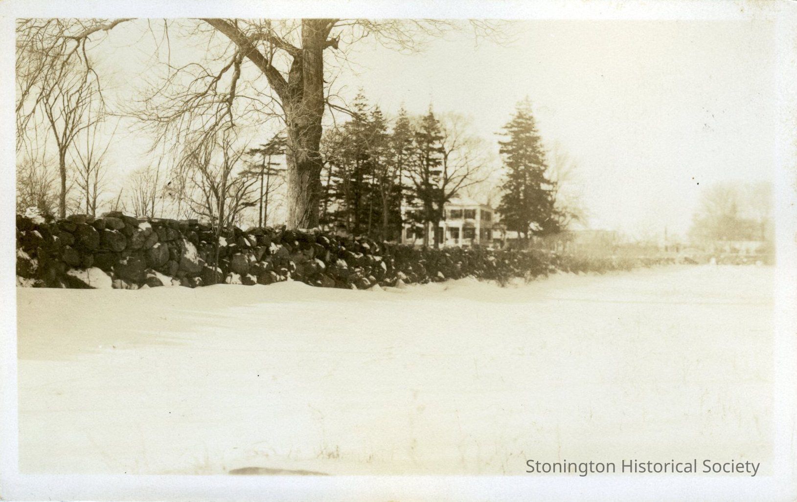 Photograph on postcard, winter scene of the exterior of the Stone Acres main house behind a stone wall, c. 1925?