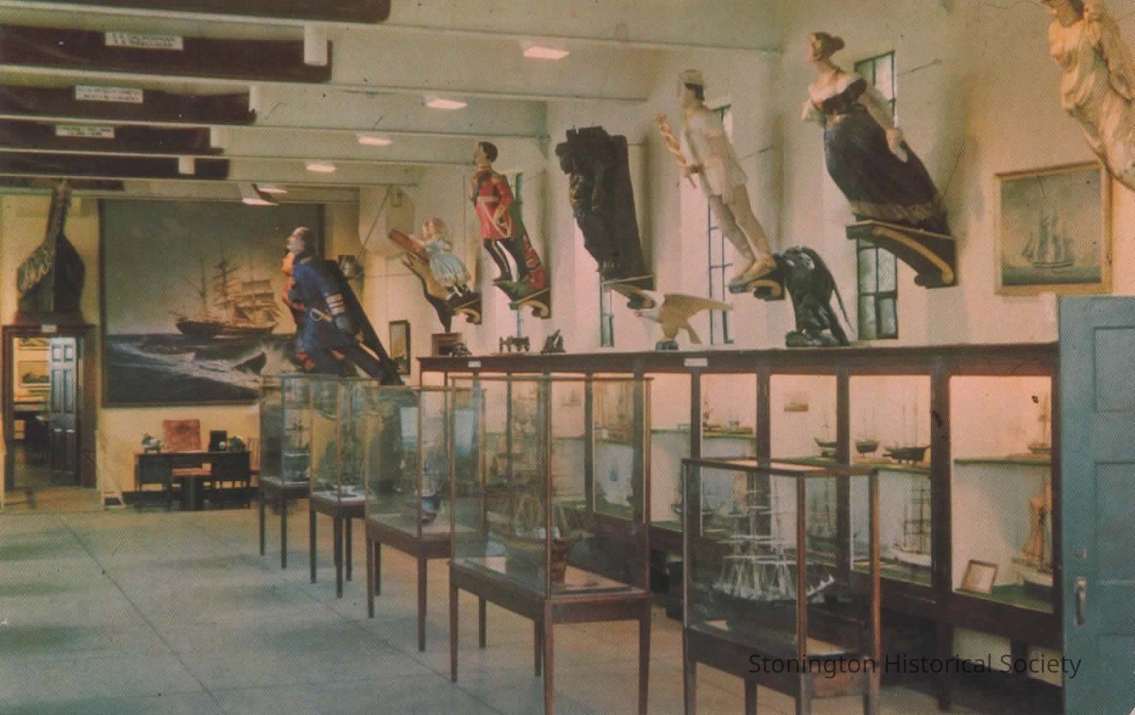 color photo postcard, "Mystic Seaport, a 19th Century Coastal Village recreated at Mystic, Connecticut. The figureheads in the Stillman building, parts of the Seaport's fabulous collection from ships that have sailed all over the world." Published by the Mystic Seaport Store.