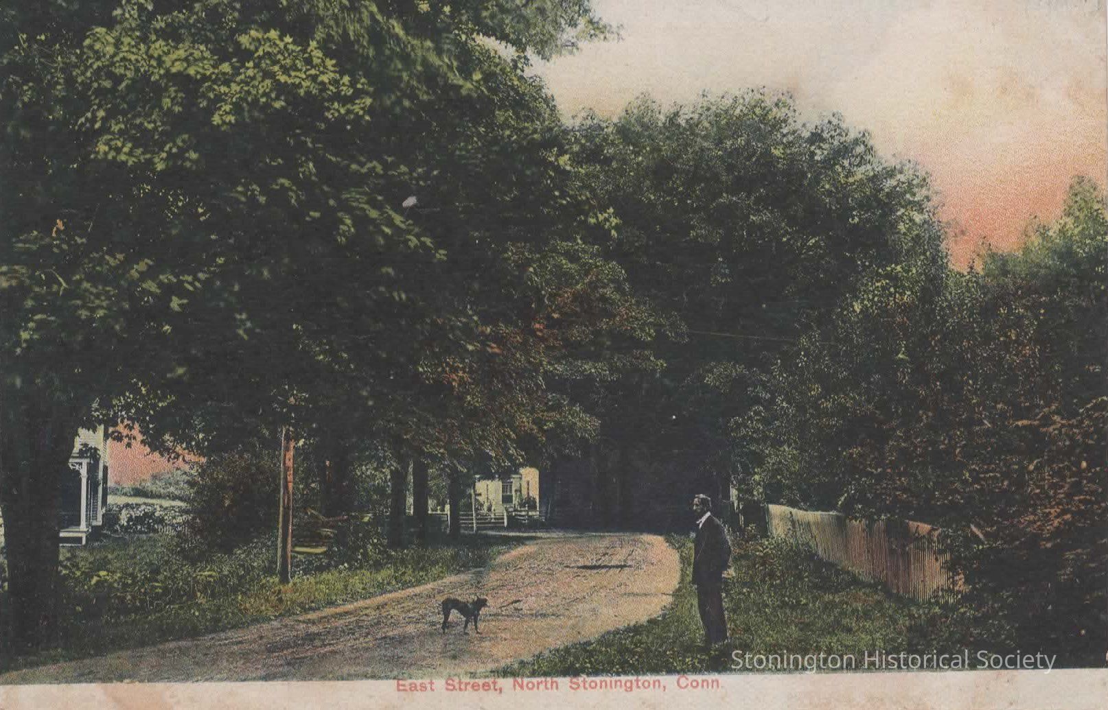 color tinted photo postcard, "East Street, North Stonington, Conn." Published by the Rhode Island News Company, Providence, R.I., photographed by Rev. Edwin J. Klock