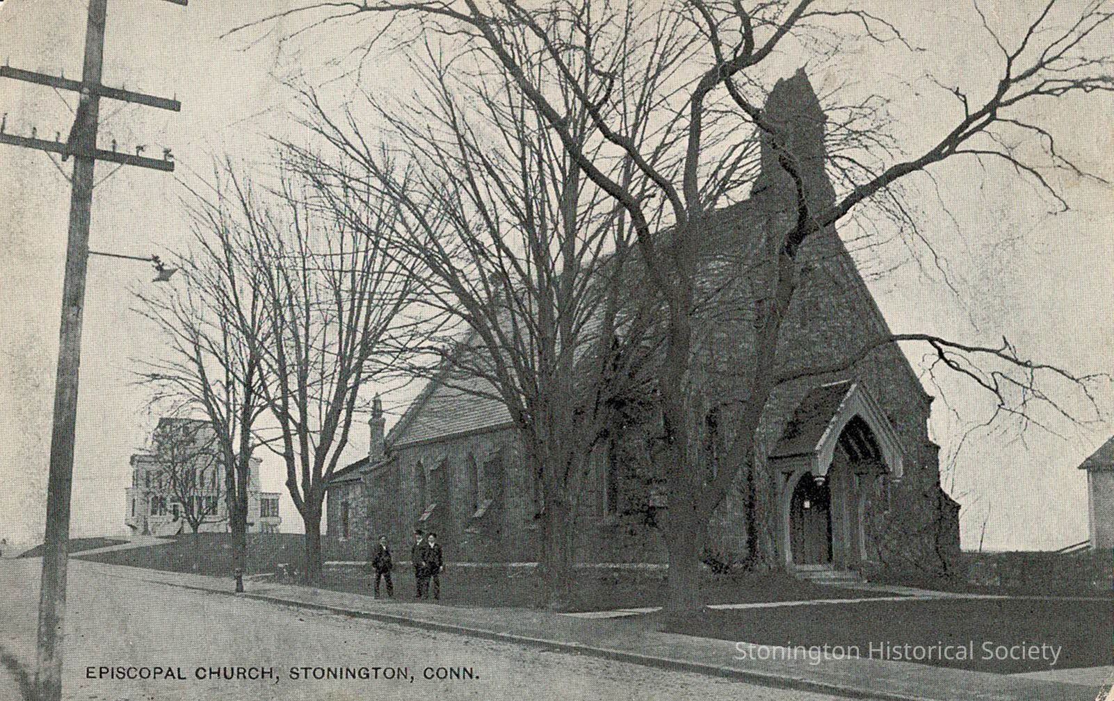 A photographic postcard showing Calvary Episcopal Church and the Eugene Atwood home in the background. Three men are standing to the left of the church.Collection