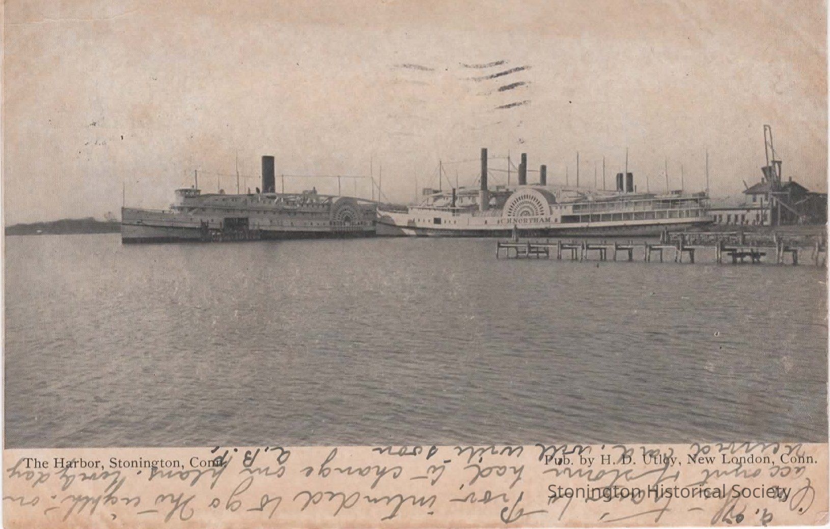 black and white postcard, "The Harbor, Stonington, Conn." addressed to Miss Mary J. Babcock c/o Mrs. Mattie E. Baker, from "A.B.P.", postmarked in Stonington, October 10, 1907.