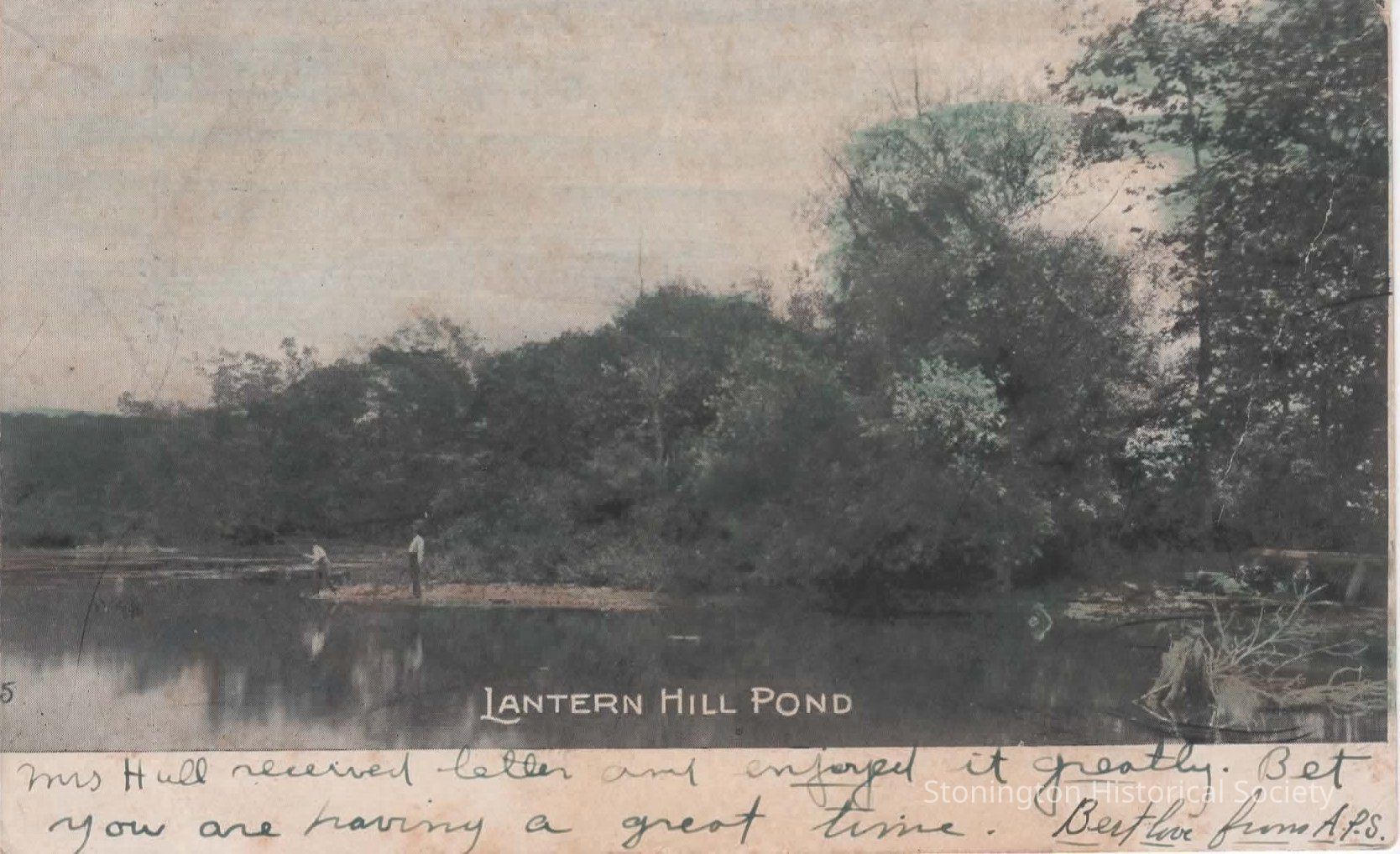 color postcard, "Lantern Hill Pond" addressed to Miss Mary J. Babcock, c/o Mrs. Mattie E. Baker, from "A.P.S.", postmarked in Stonington, August 11, 1907.