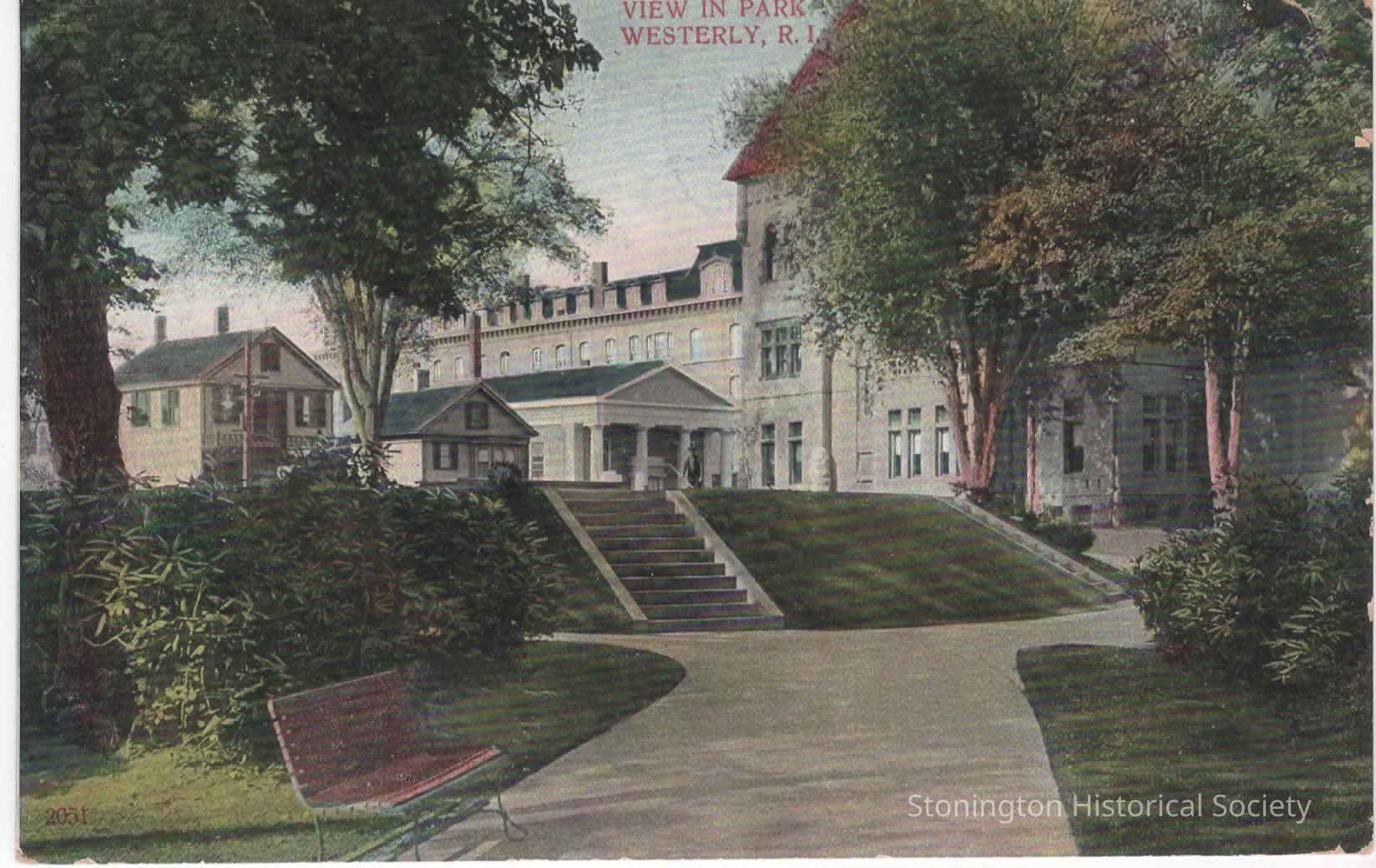 color postcard, "View in Park, Westerly, R.I." addressed to Miss Mary J. Babcock, c/o Mrs Mattie E. Baker, from "A.B.P.", October 31, 1907.