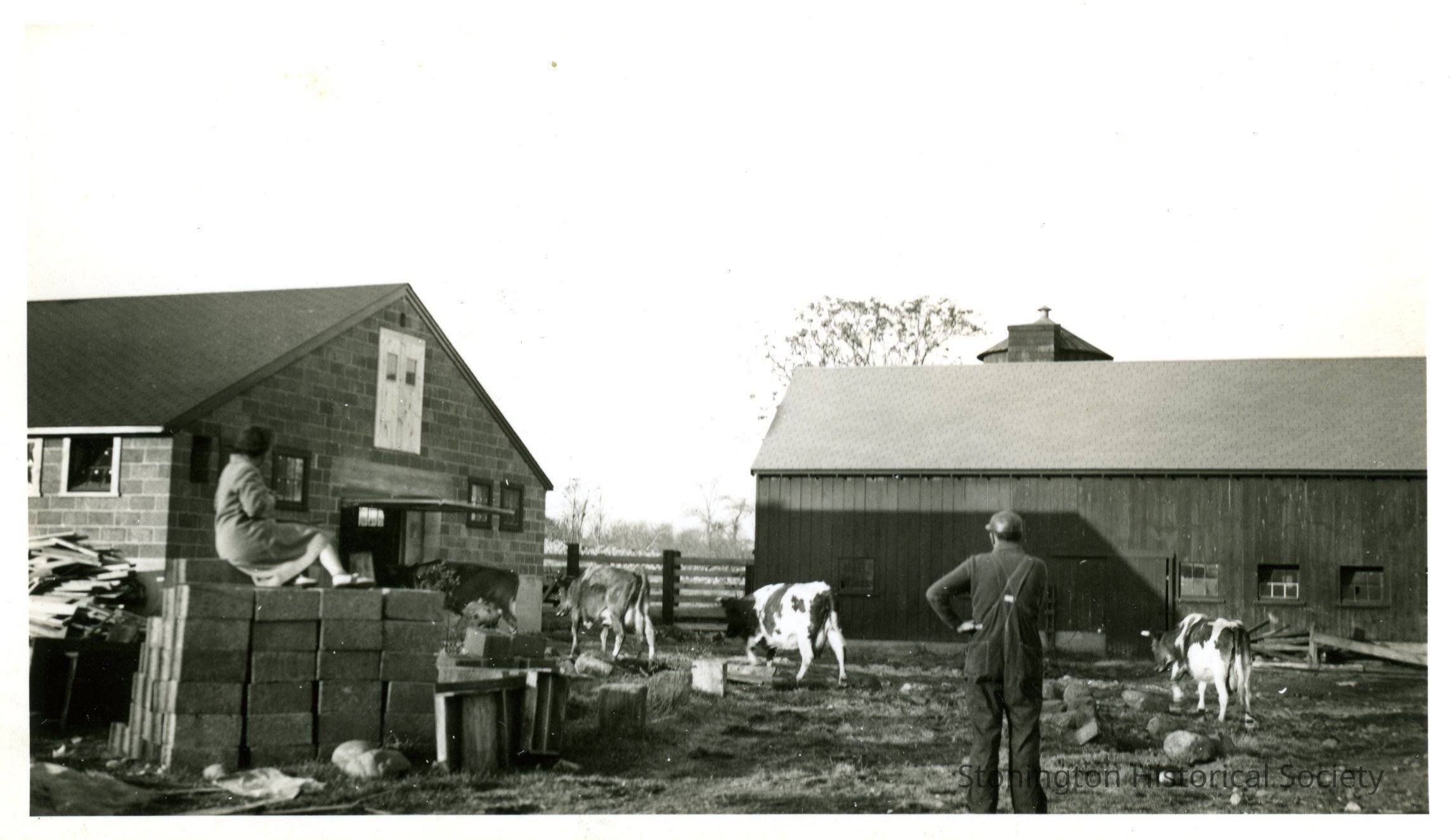 Photograph, cows walking into the cow barn at Stone Acres, c. 1946.