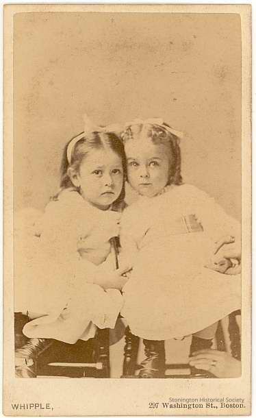 Portrait of two young girls (sisters?) seated with adult's (mother's?) hand seen at lower right. Possibly two sisters aged 4 and 2Collection