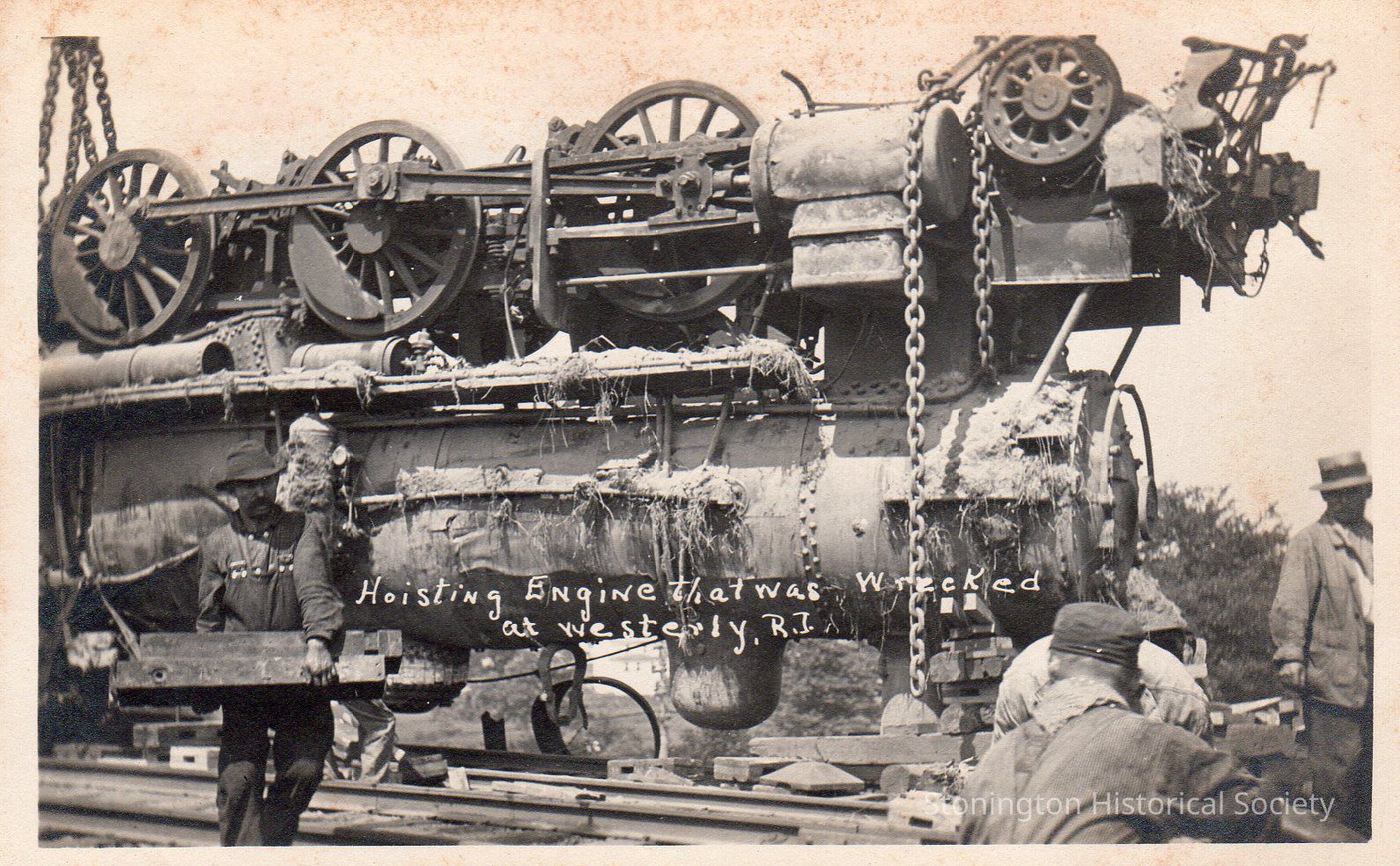 4 black and white photo postcards showing a train derailment in Westerly, R.I. to Miss Mary J. Babcock, from "Amelia" July 15, 1911.