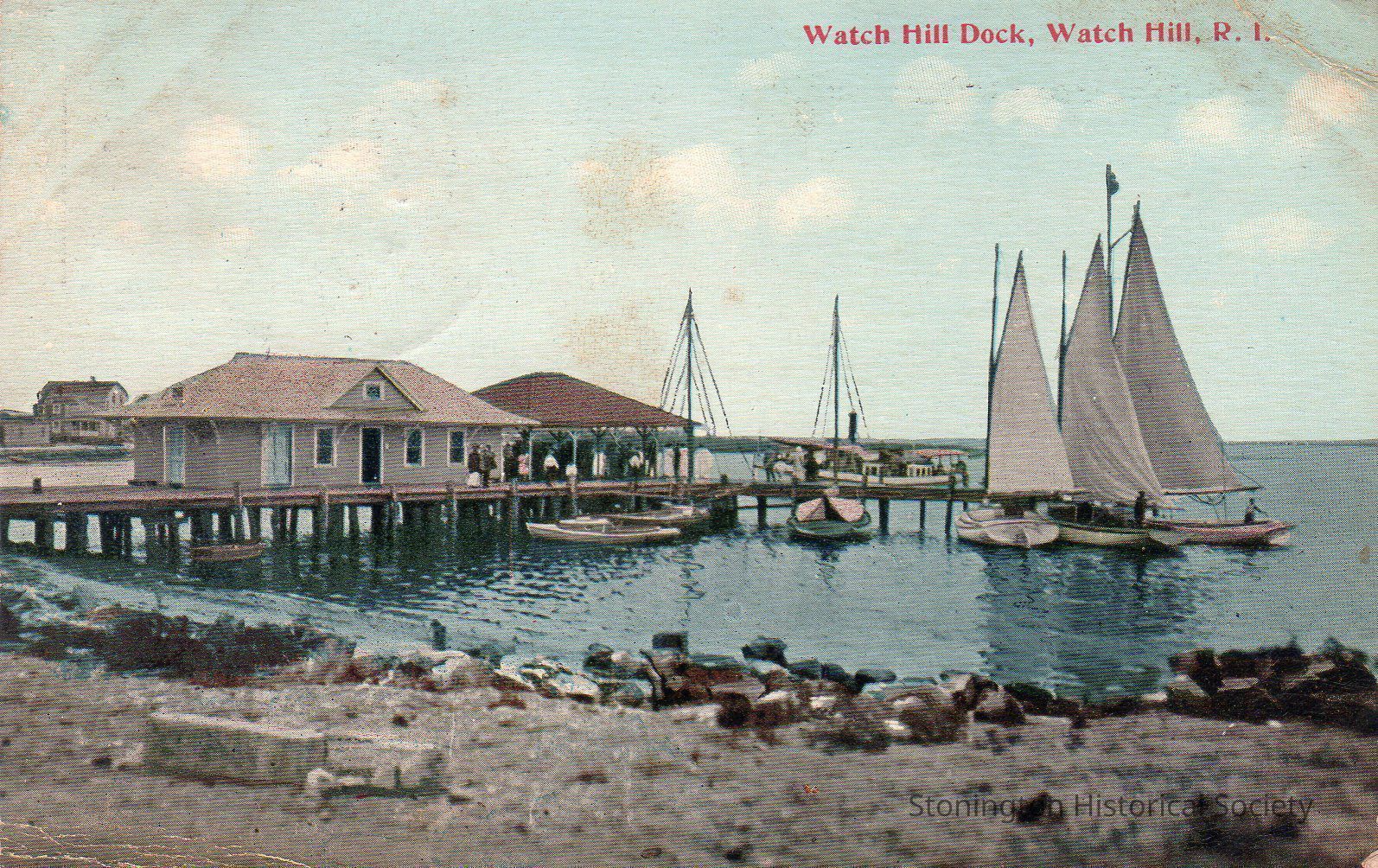 color postcard, "Watch Hill Dock, Watch Hill, R.I." addressed to Miss Mary J. Babcock, from "Clarence" July 17, 1911.