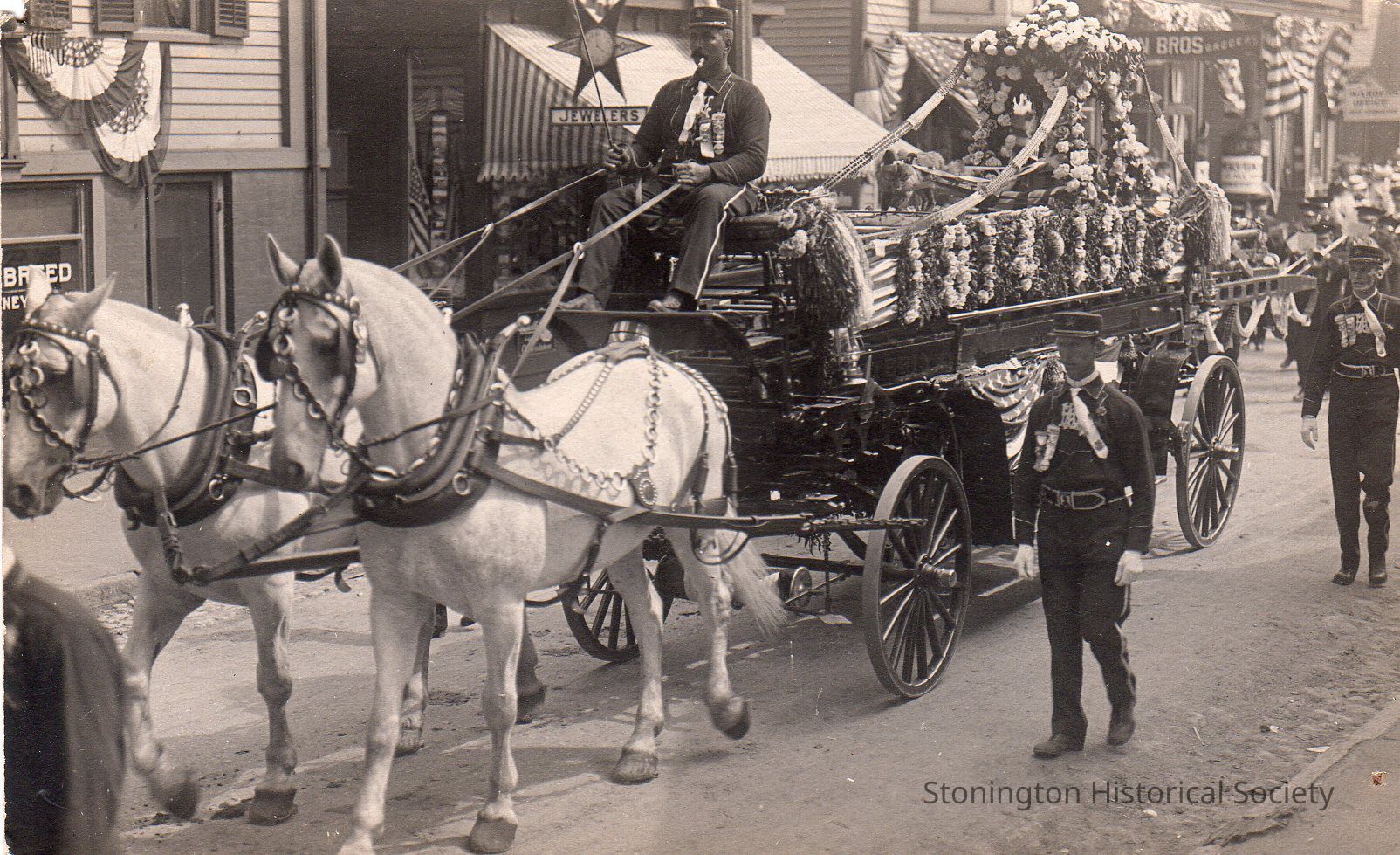 Postcard, black and white photograph of the Battle of 1814 Centennial Parade in Stonington Borough, August 1914.