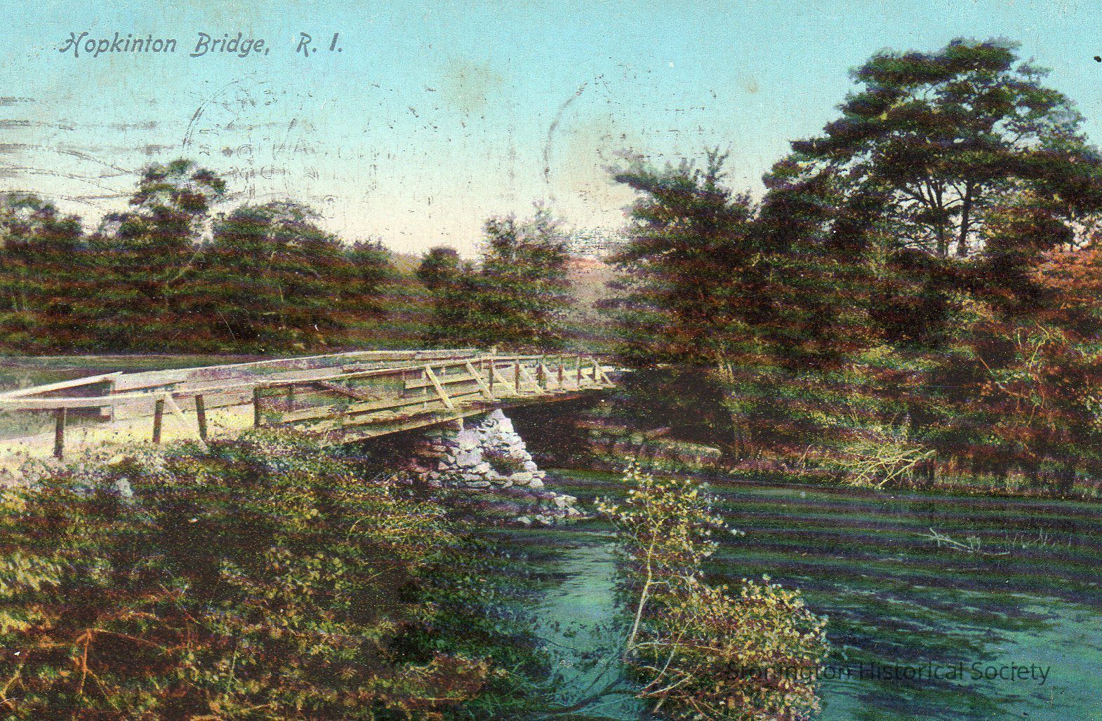 color postcard, "Hopkinton Bridge, R.I." addressed to Miss Mary J. Babcock, c.o. Moses Pendleton, Stonington, from her niece Minnie Babcock, January 16, 1913.