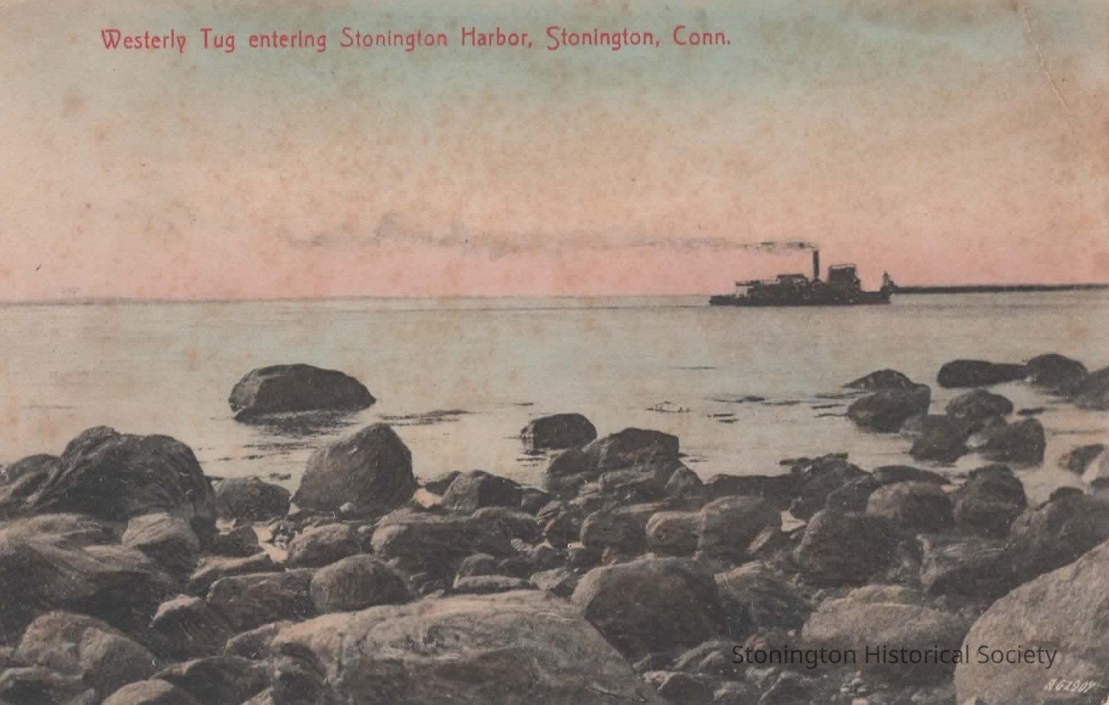Color tinted postcard, "Westerly Tug entering Stonington Harbor, Stonington, Conn.," postmarked May 4, 1922