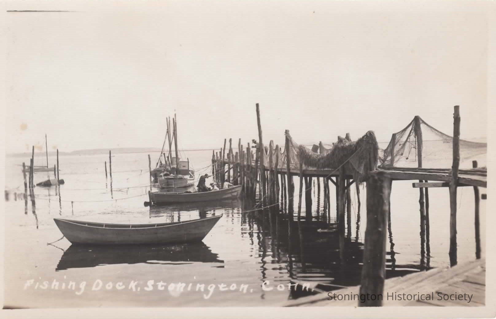 black and white photo postcard of the "Fishing Dock, Stonington, Conn."