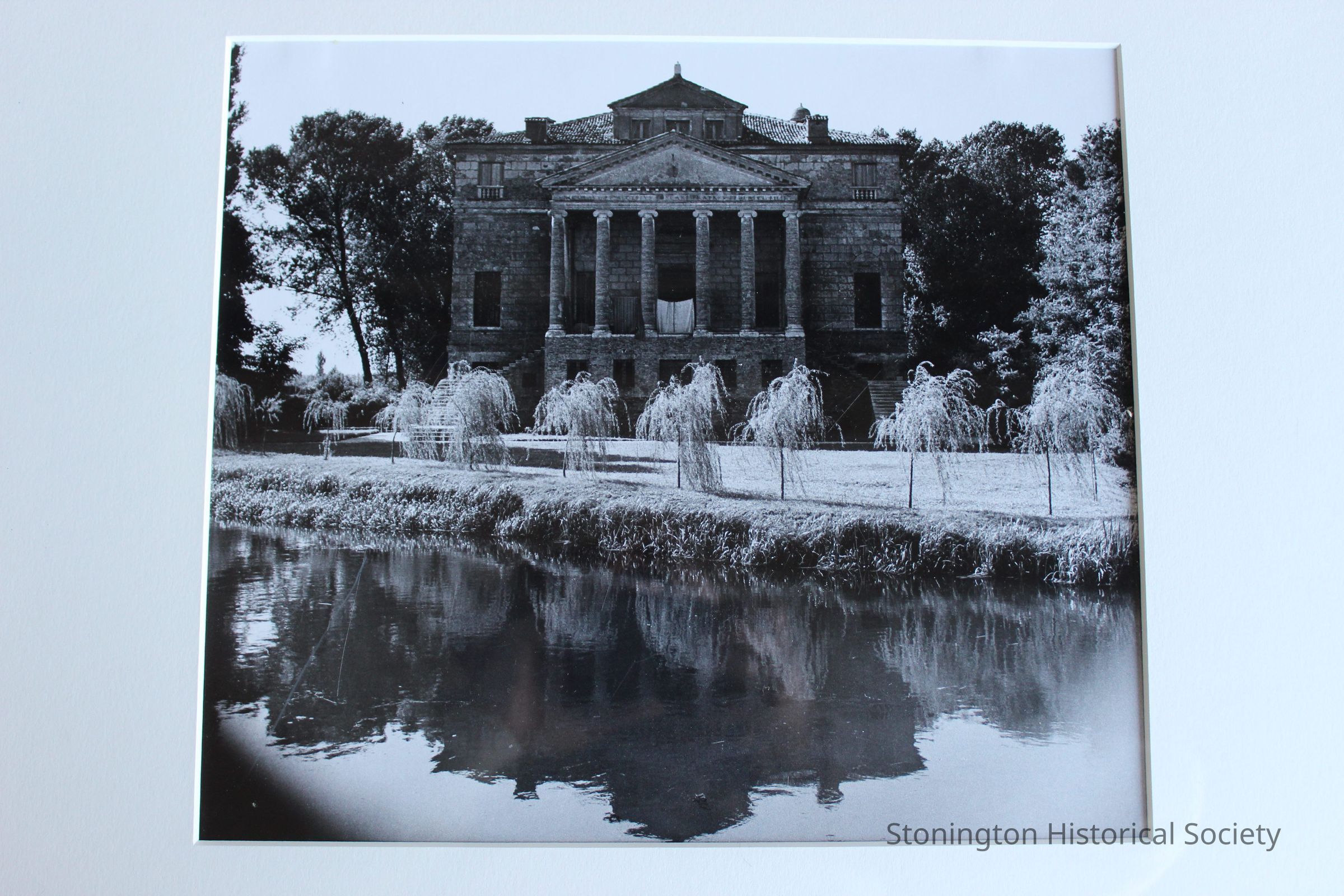 Framed black and white photograph of Villa Foscari taken by Rollie McKenna. Villa Foscari was built in 1555, designed by Andrea Palladio. This particular photograph is of the facade facing the Brenta Canal in Brenta, which is near Venice, Italy.