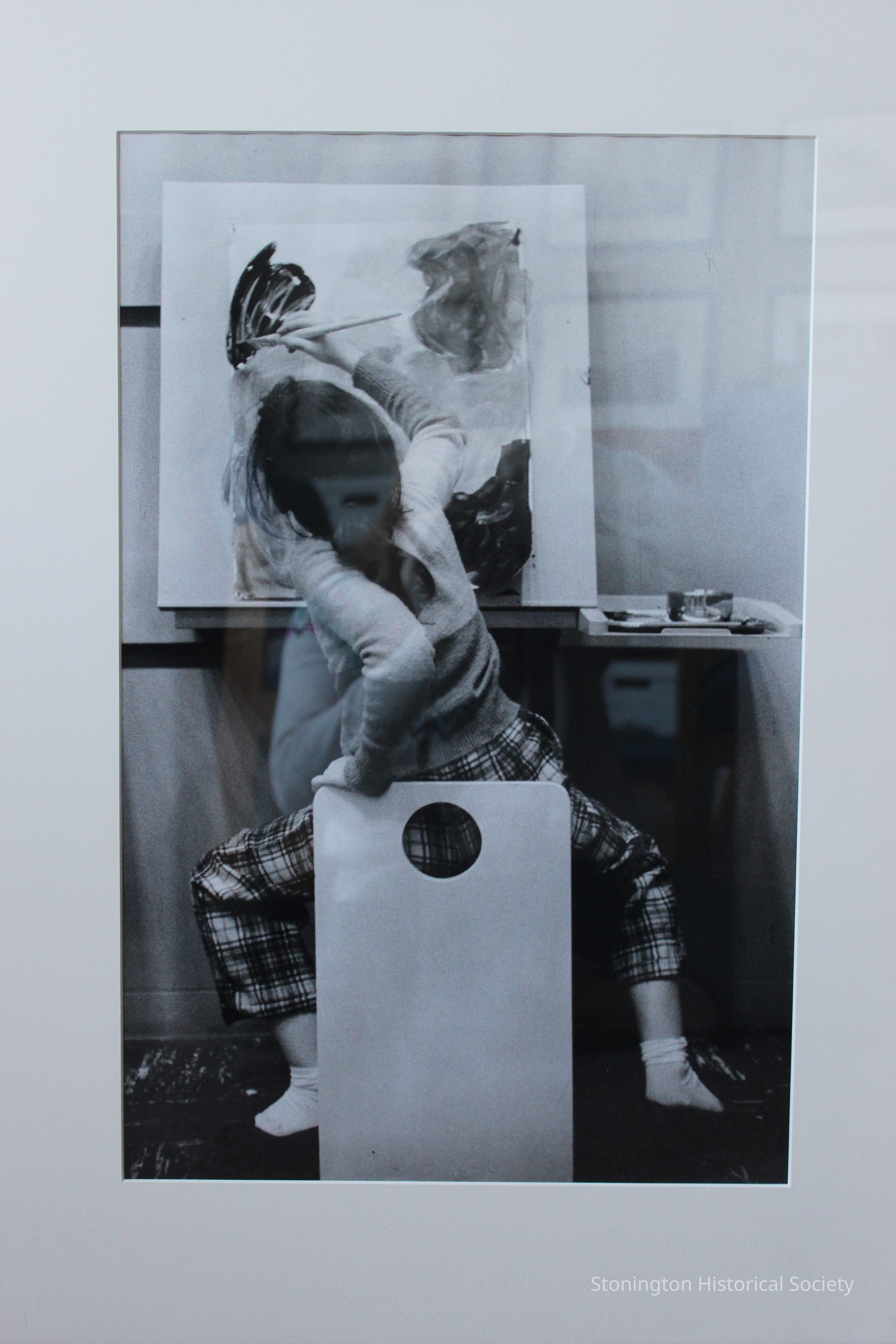 Framed black and white photograph taken by Rollie McKenna of a child painting at the Museum of Modern Art in New York City. Framed dimensions measure 24.5 x 30.25