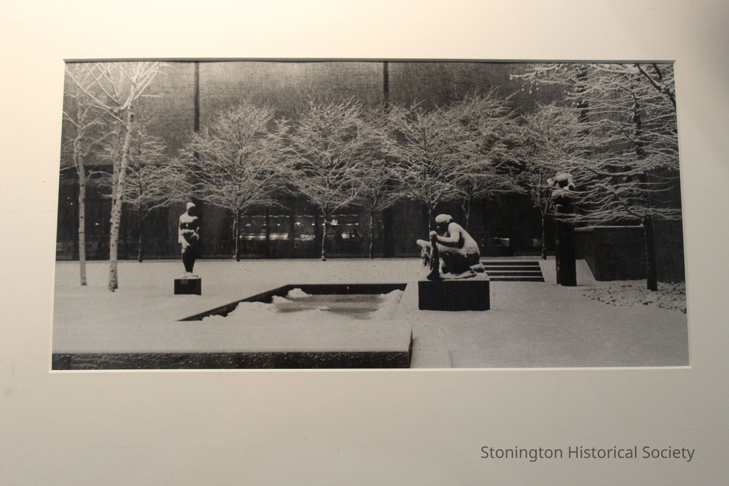 Framed black and white photograph taken by Rollie McKenna of the Museum of Modern Art sculpture garden in winter 1957. The reflecting pool and a few sculptures are visible in the snow.
