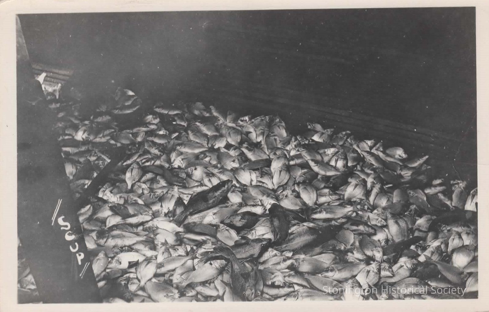 black and white photo postcard of a scup fish catch.