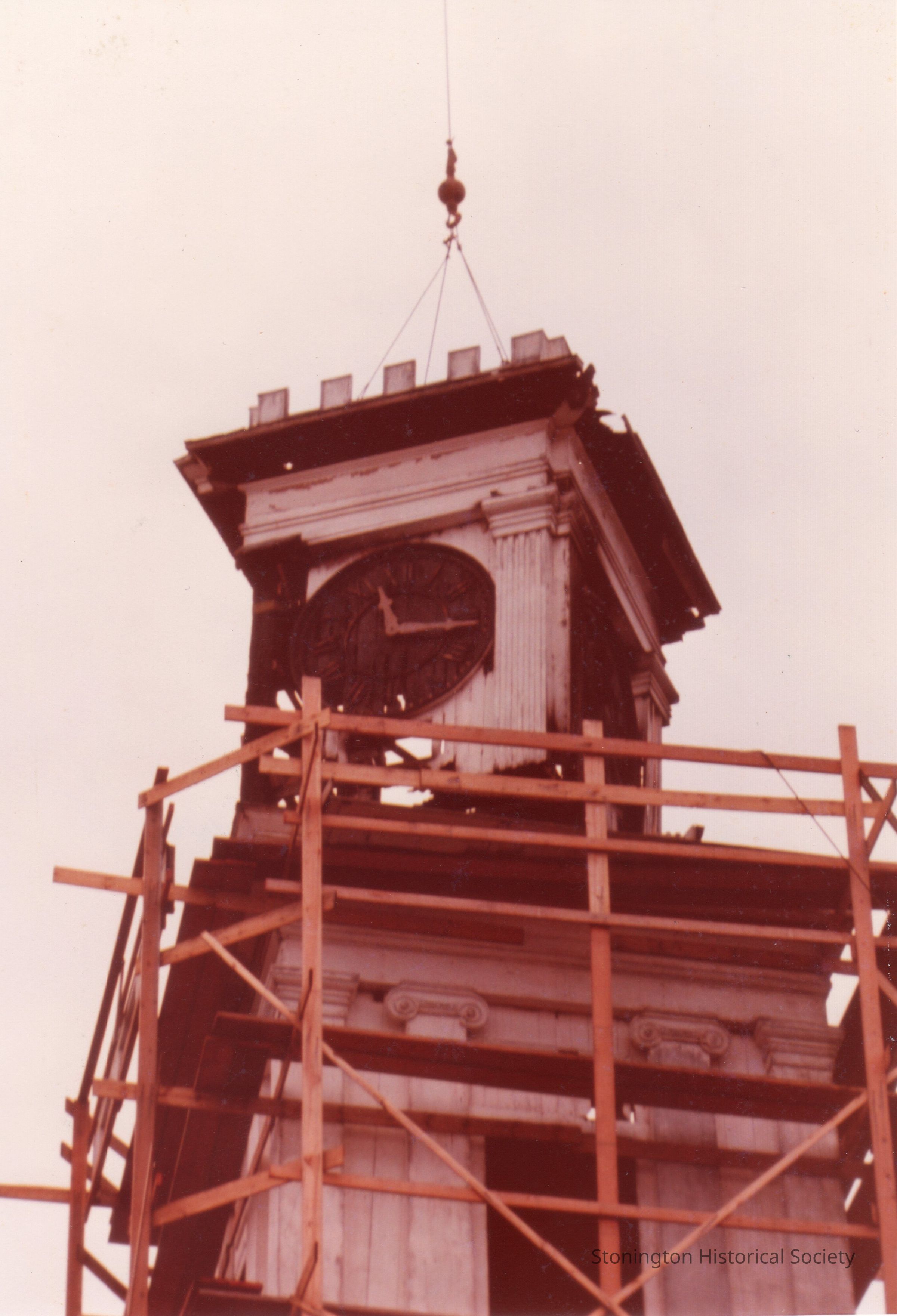 Color snapshot and enlargement of the clock tower on the Congregational Church following the fire in 1971. Given to the Society by Harry Northup before his death. With note: "On November 20, 1971, the Congregational Church, now the United Church, was having a great deal of repair work done on the tower. Something happened after the workmen left for the night and a fire started in the tower. Luckily it was discovered in time to save the Church. As can be seen, the top of the tower was lifted off by a crane and taken to a shop in Groton, Connecticut. All the dimensions were lifted and a completely new top was constructed. It was then put back by the crane and secured to the braced up lower section. All the clock works were saved, cleaned, replaced and are still going today in 2008. In 2007 to 2008 an extensive overhaul repaired the tower, refinished the clock faces and hands with gold leaf, a new roof was put on the church building, the front side was painted and also the four huge pillars were scraped and painted. It really looks great."Collection
