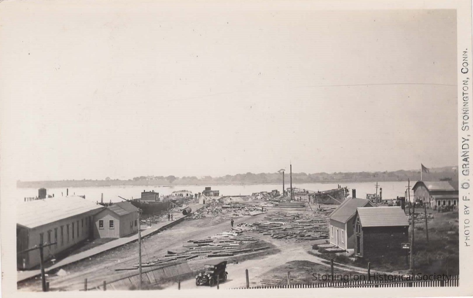 black and white photo postcard of the Stonington Ship Construction and Trading Co. yard, c. 1920s-1930s. Photographed by F. O. Grandy.