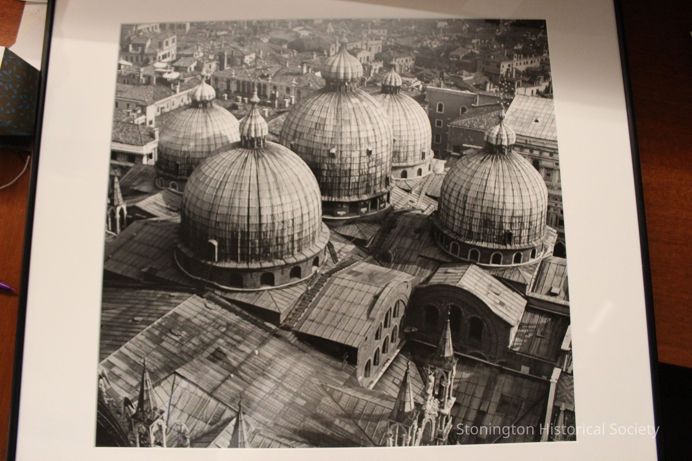 A framed black and white photograph taken by Rollie McKenna of the Florence Cathedral in Italy. The photograph is of the roof and five domes on top of the cathedral and a bit of the surrounding sprawl of the city is visible.