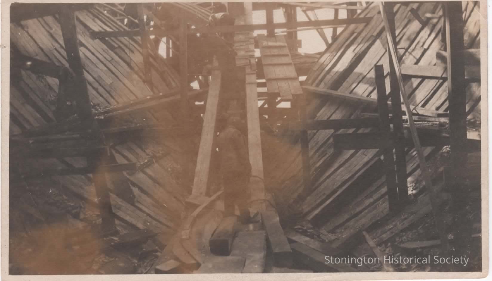 black and white photo postcard of a ship under construction.
